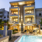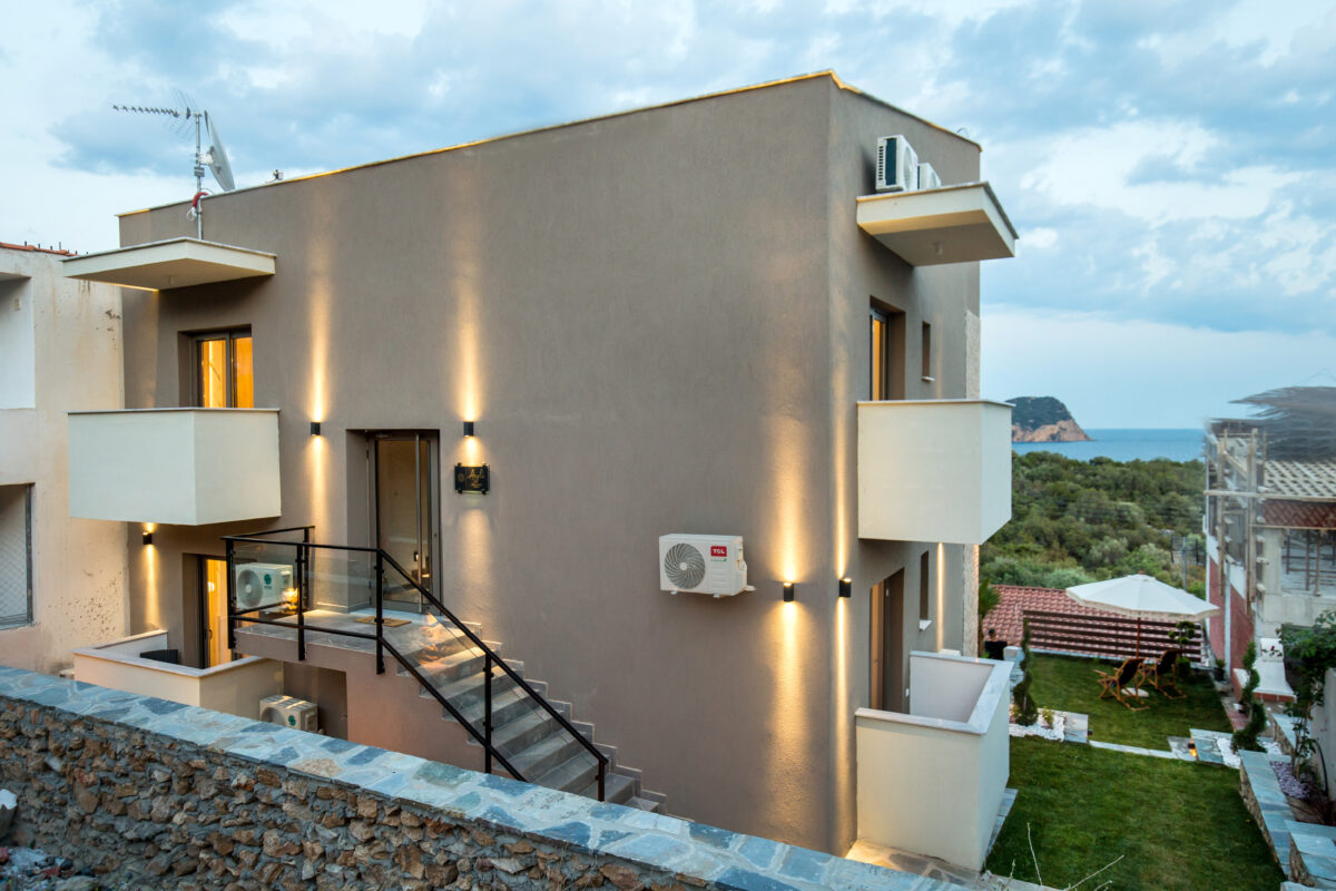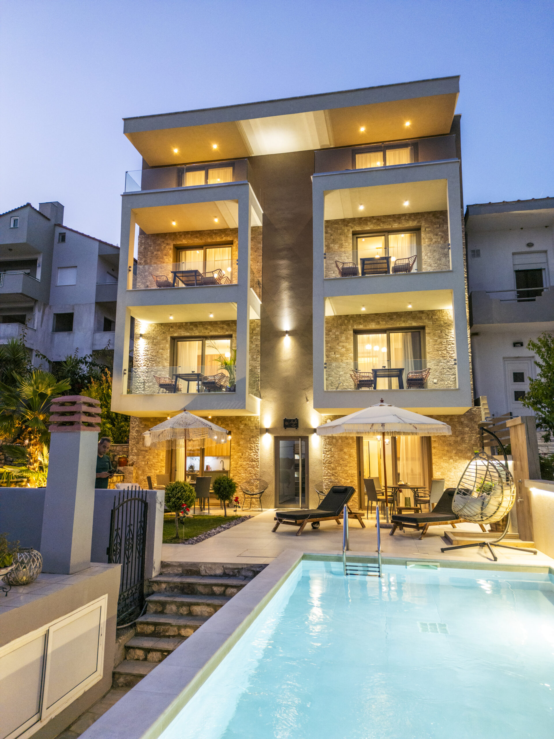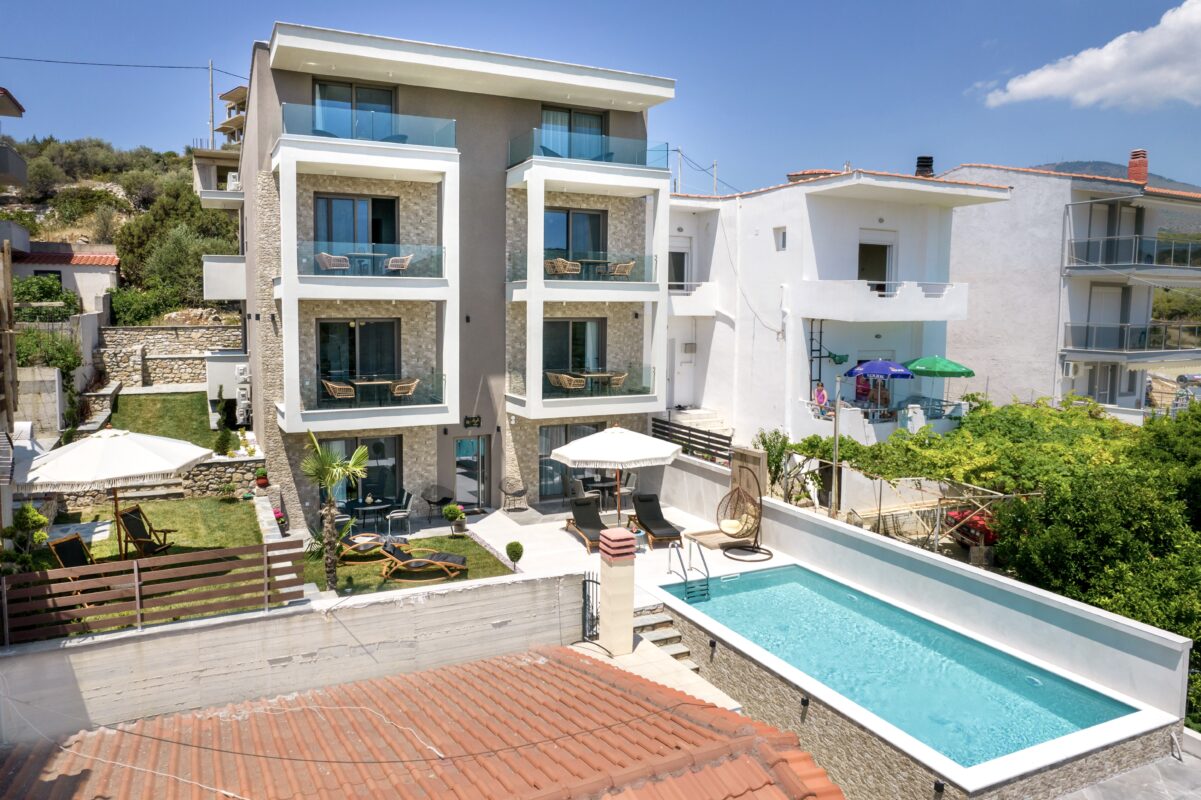 Aigli Skala Maries Deluxe oferă cazare modernă în Skala Maries, Thassos, cu apartamente spațioase, piscină, WiFi gratuit, parcare, balcon și vedere la mare, ideală pentru familii.