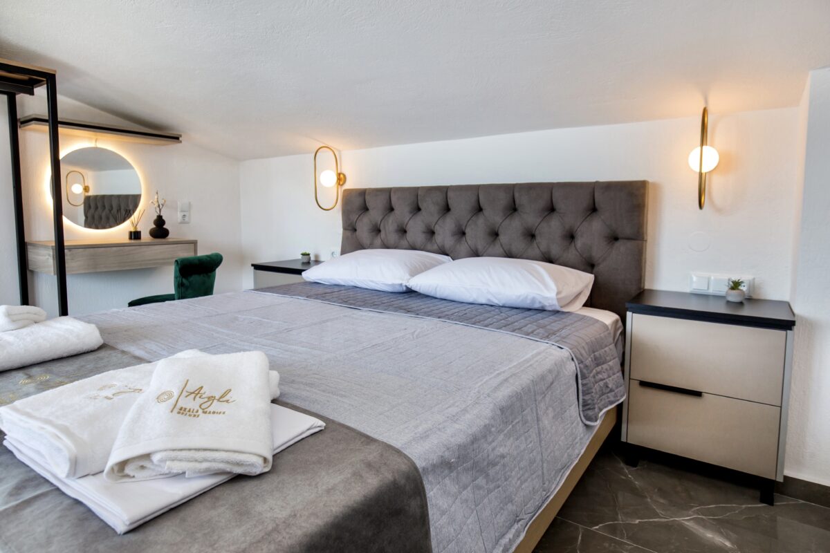 Aigli Skala Maries Deluxe oferă mai multe tipuri de apartamente, adaptate diferitelor nevoi de cazare. Maisonette-urile sunt potrivite pentru până la 6 persoane și includ două dormitoare cu paturi duble mari și un living cu canapea extensibilă. Apartamentele Deluxe pot găzdui până la 4 persoane și includ un dormitor confortabil și living cu spațiu suplimentar de dormit. Există și apartamente cu vedere la piscină, ideale pentru turiști care doresc un ambient plăcut și acces rapid la zona de relaxare.