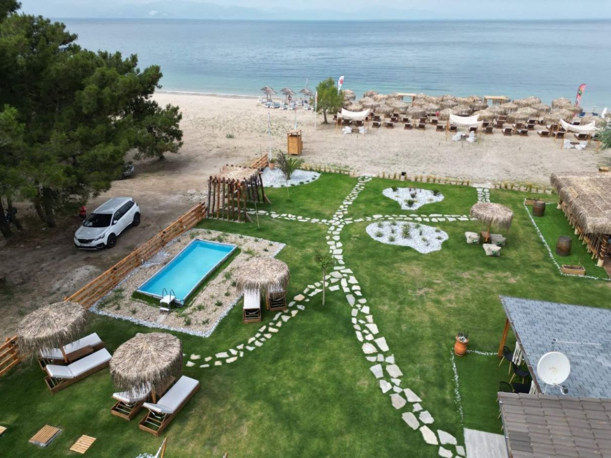 Calma Beach Bar este un loc ideal pentru zilele toride de vacanță. Este amenajat pe plaja din Skala Prinos, renumită pentru nisipul fin, intrare lină în apă și umbra pinilor din apropiere.