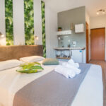 Apartament cu 1 dormitor – cameră cvadruplă, numărul maxim de persoane 4, suprafaţa camerei 40 m². Este dotată cu chicinetă, cuptor, frigider, ustensile de bucătărie, cadă sau duş. Alte dotări: uscător de păr, articole de toaletă gratuite, seif, TV cu ecran plat, aer condiţionat, balcon și patio, intrare privată.