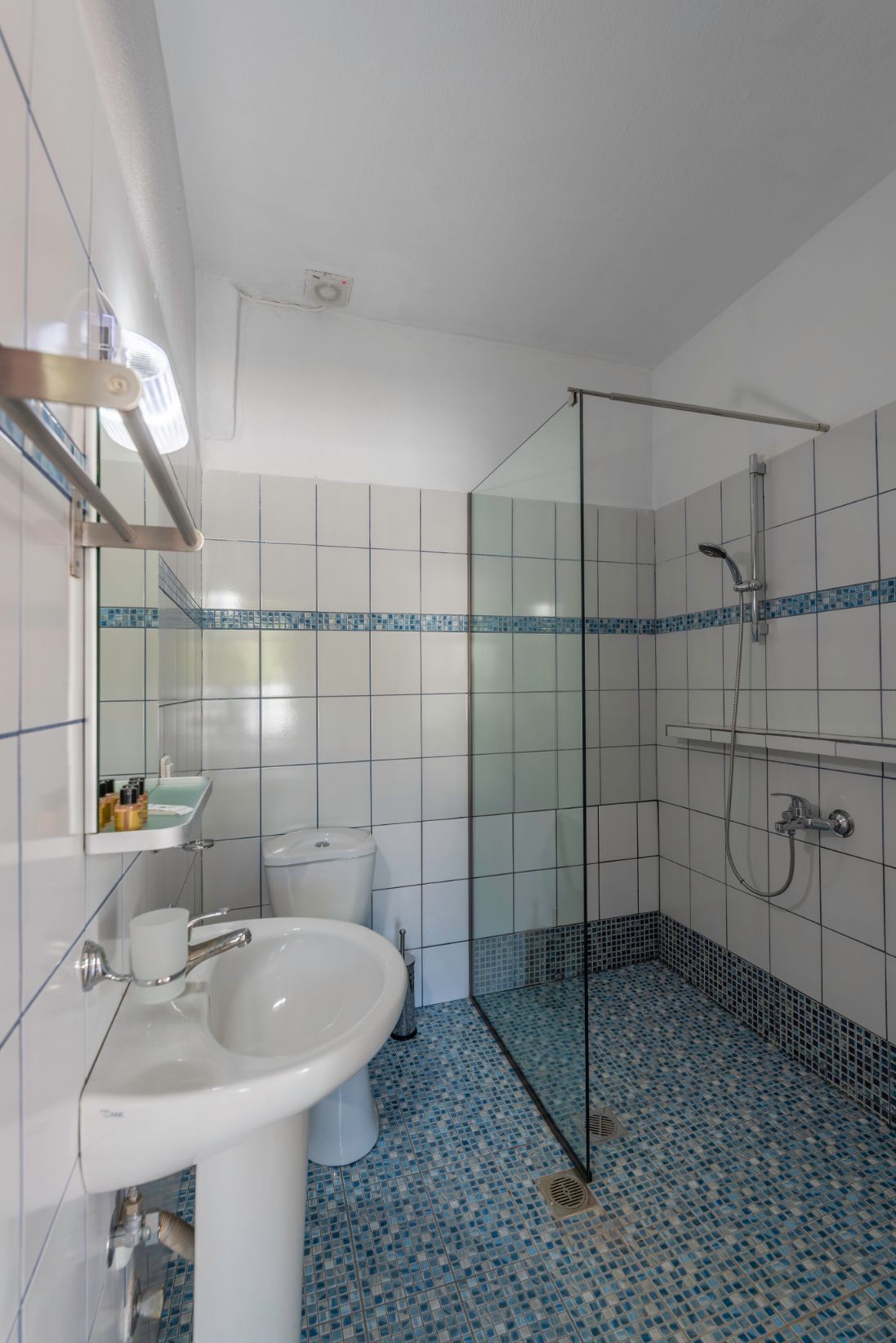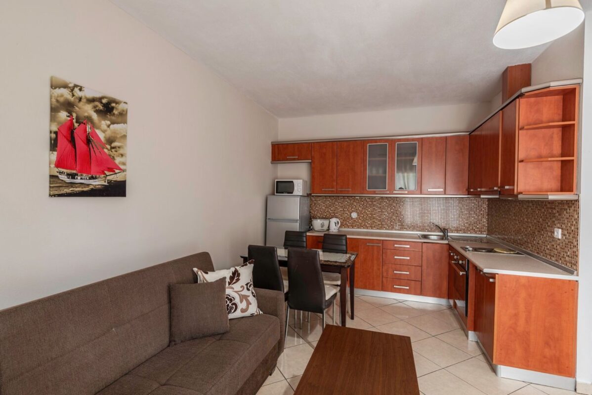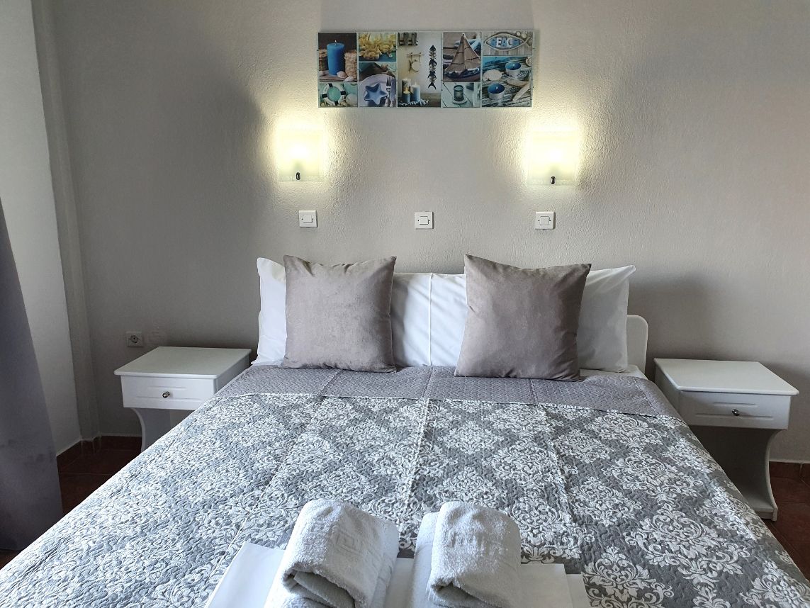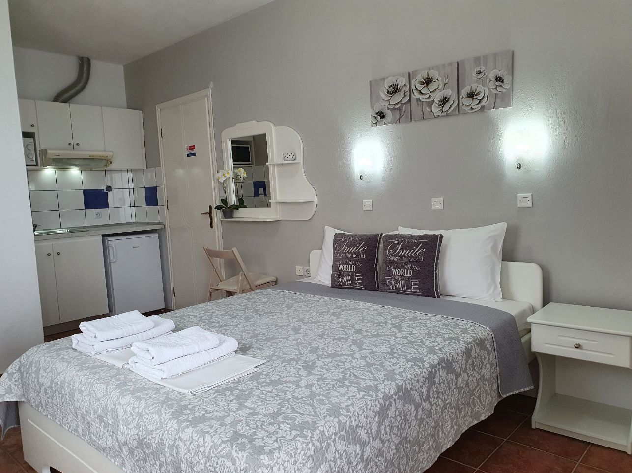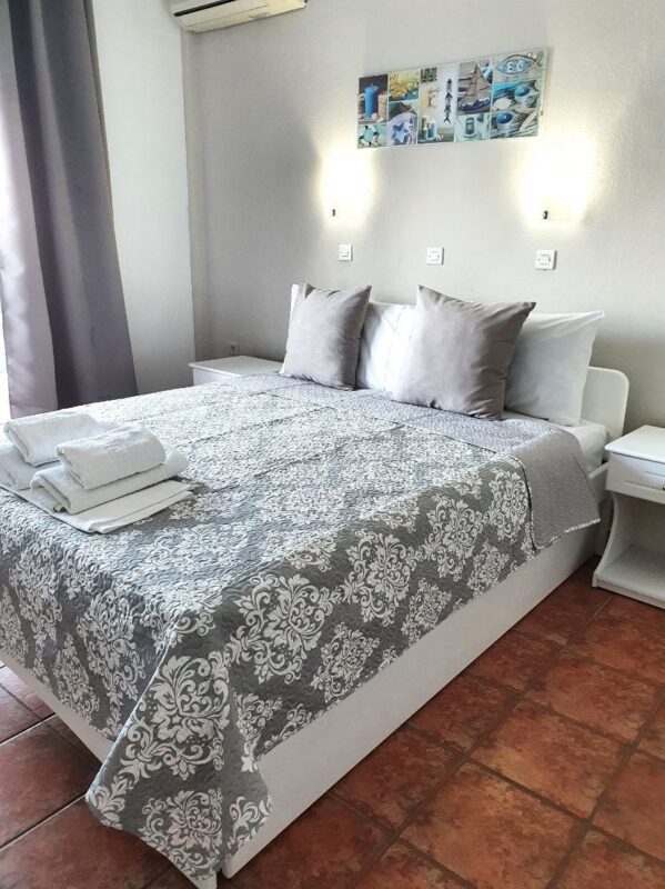 Sunt 5 studiouri spațioase, fiecare pentru trei persoane, și 2 apartamente de familie generoase. Cu un stil elegant și confort modern, acestea asigură un sejur relaxant. Dispuneți de o bucătărie complet echipată, frigider, baie cu facilități, Wi-Fi, televizor, seif și terasă privată cu vedere la Marea Egee sau la munte.