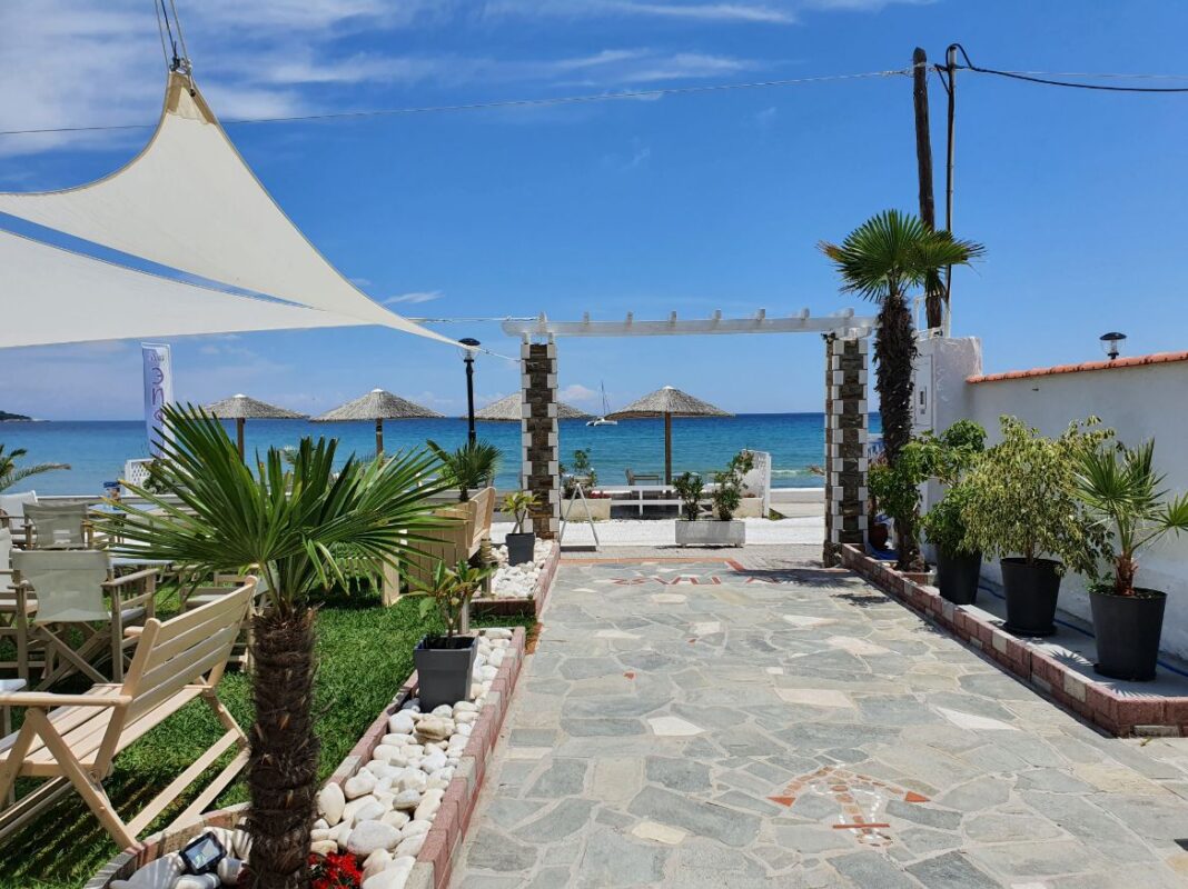 Pe plaja frumos amenajată, aveți acces la șezlonguri și umbrele de soare.