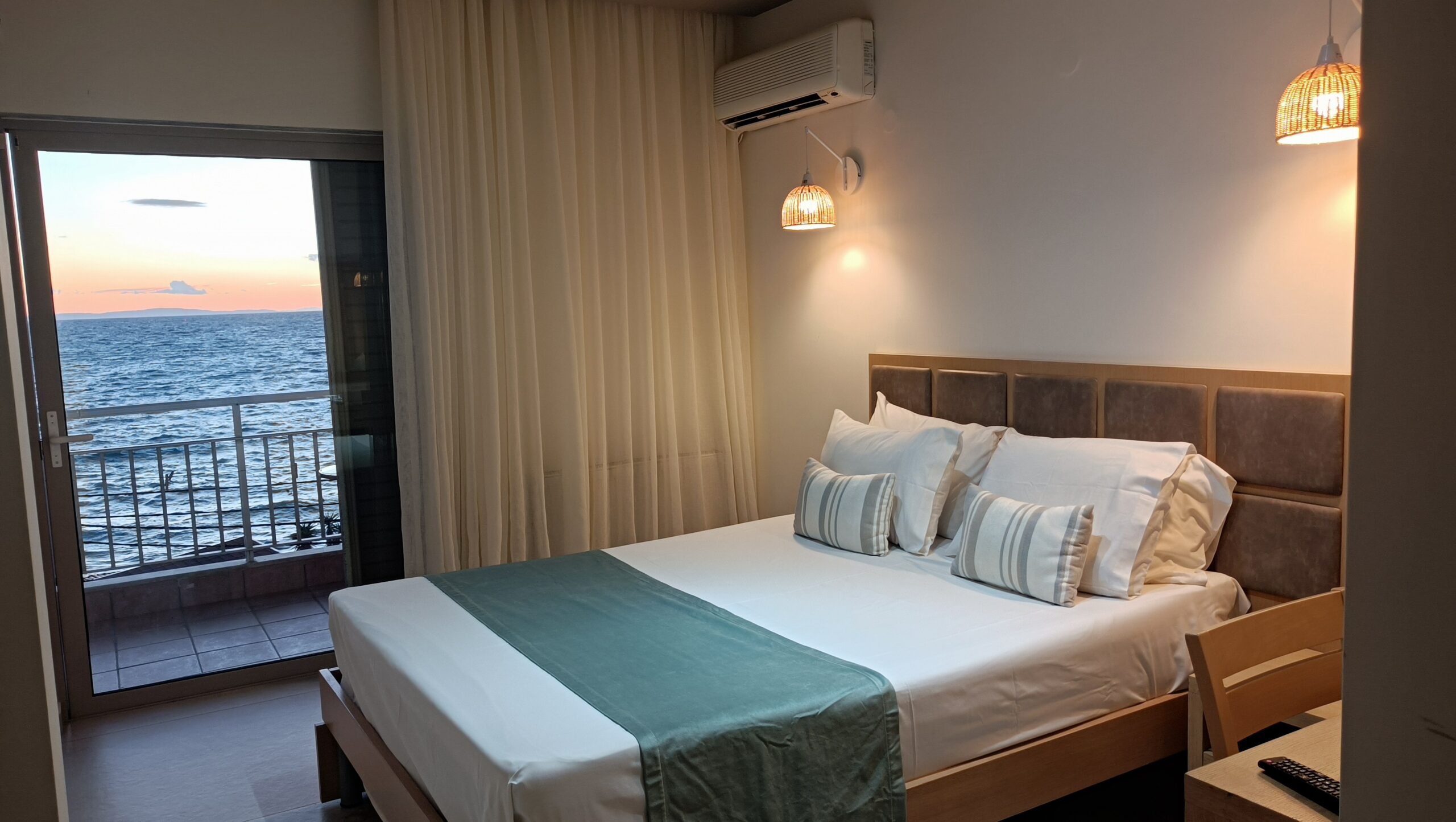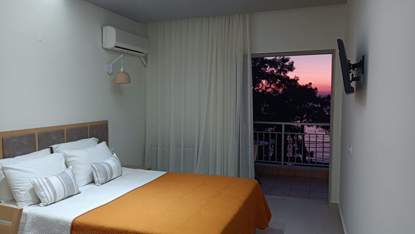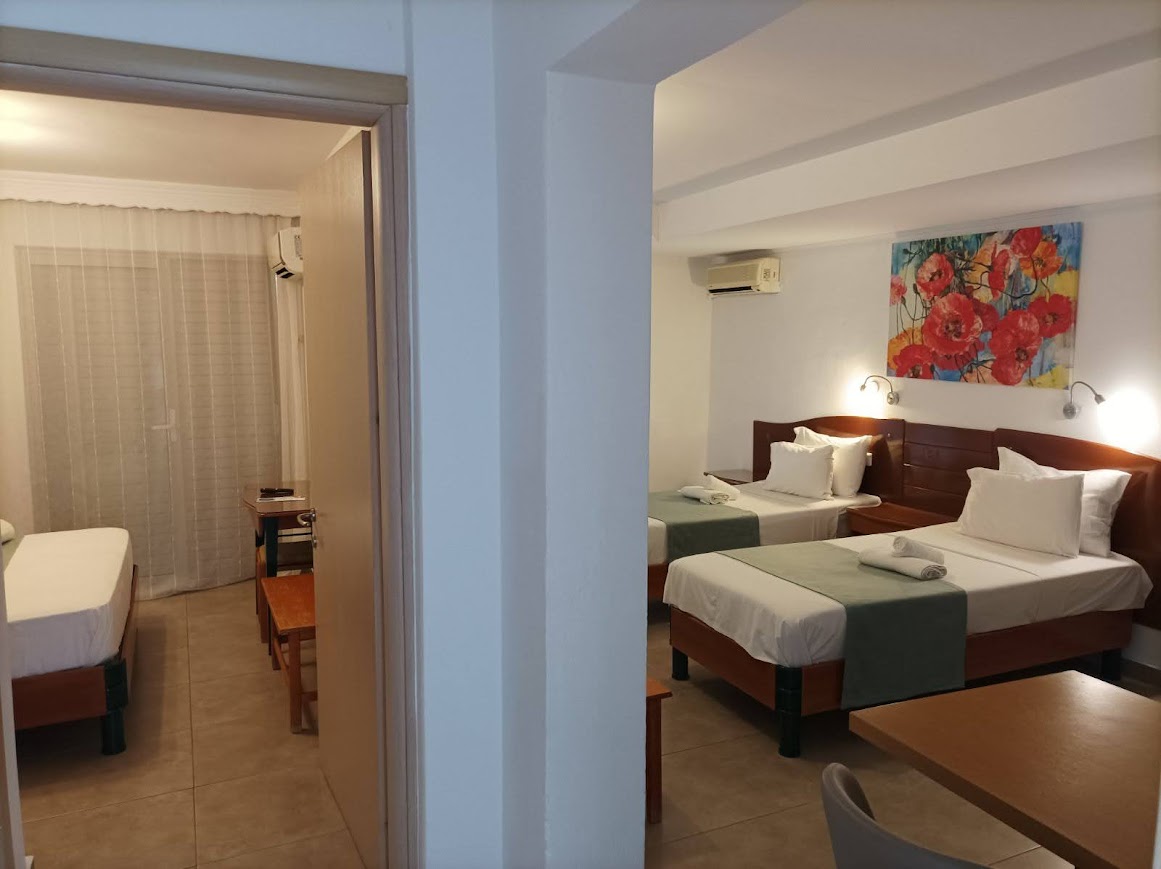 Unitățile de cazare oferă condiții moderne și funcționale pentru un sejur confortabil. Fiecare cameră este dotată cu aer condiționat și balcon privat. Balcoanele oferă vedere către munți sau către Marea Egee. Dotările standard includ televizor cu canale prin satelit și frigider. De asemenea, sunt disponibile seif și uscător de păr. Amenajarea camerelor respectă un stil simplu și practic. Curățenia și confortul sunt priorități constante.