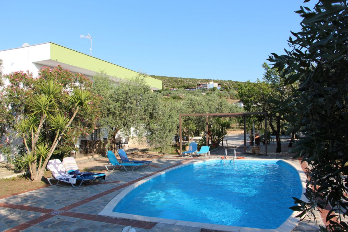 Villa Iatrou, o oază de relaxare, în Potos. Apartamente spațioase, piscină, facilități moderne și atmosferă destinsă.
