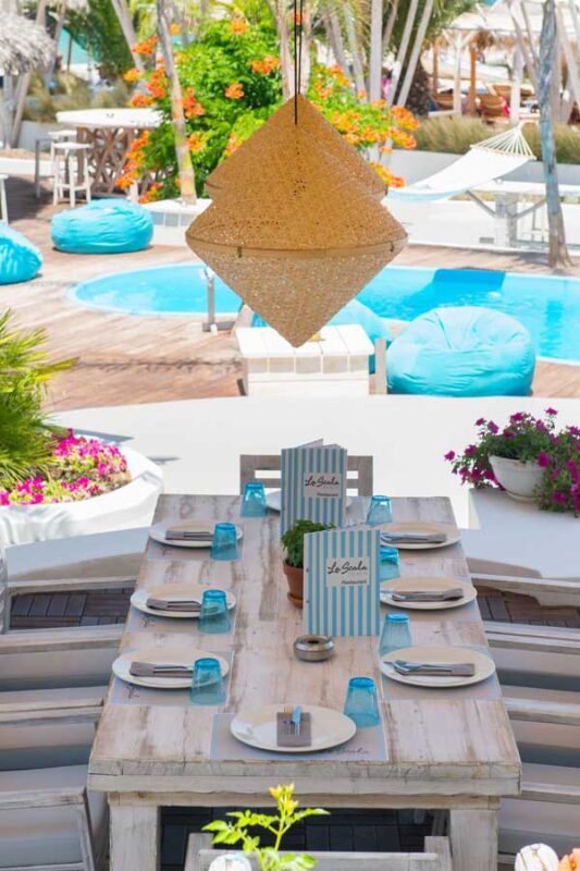 Conceptul principal al beach barului La Scala a fost acela de a recrea atmosfera vieții la bordul unui iaht luxos pe plajă, o propunere șic și stilată de a petrece o zi relaxantă sub soare, însoțită de sclipirea șampaniei și de nonșalanța exotică a narghilelelor.