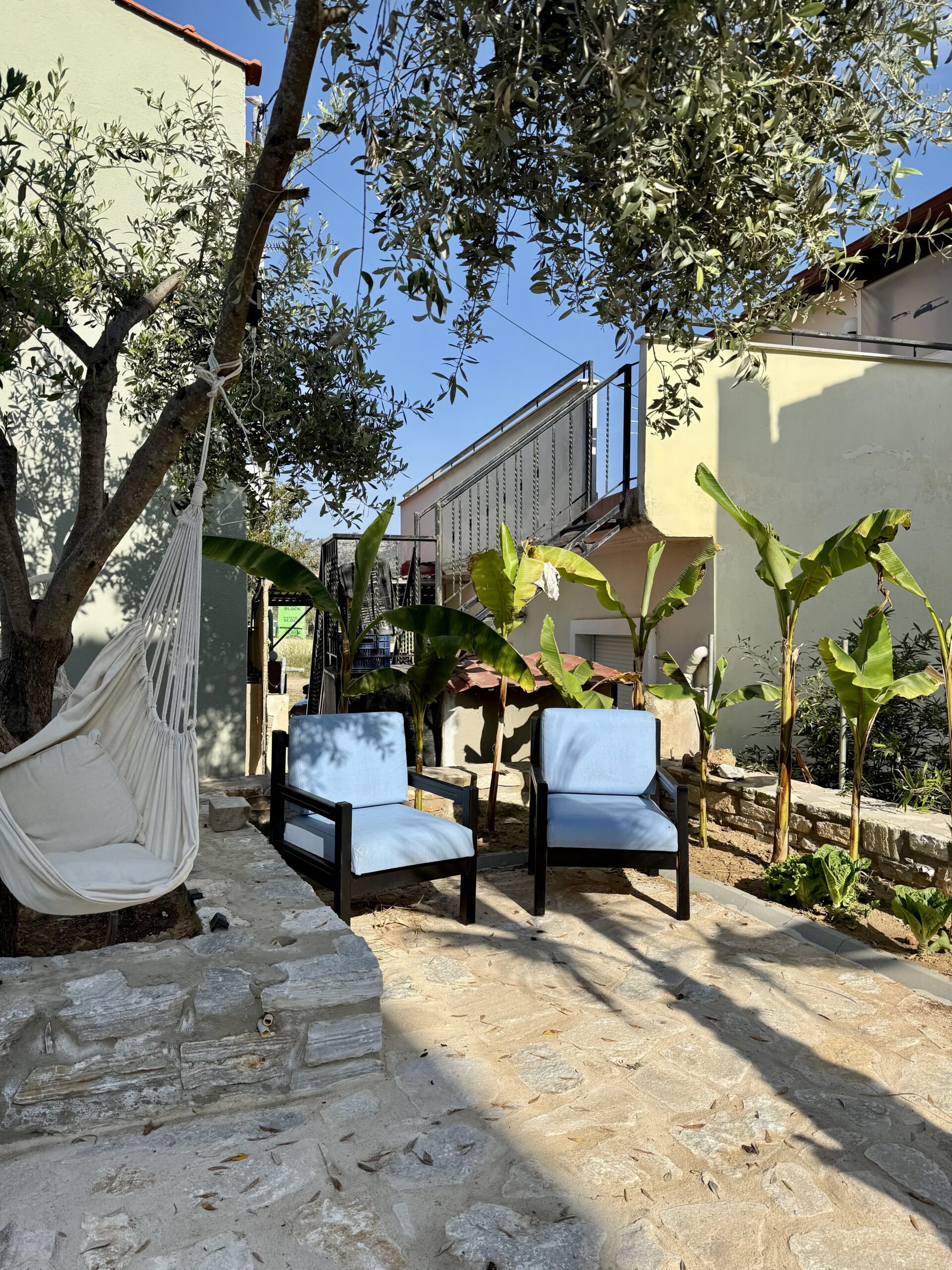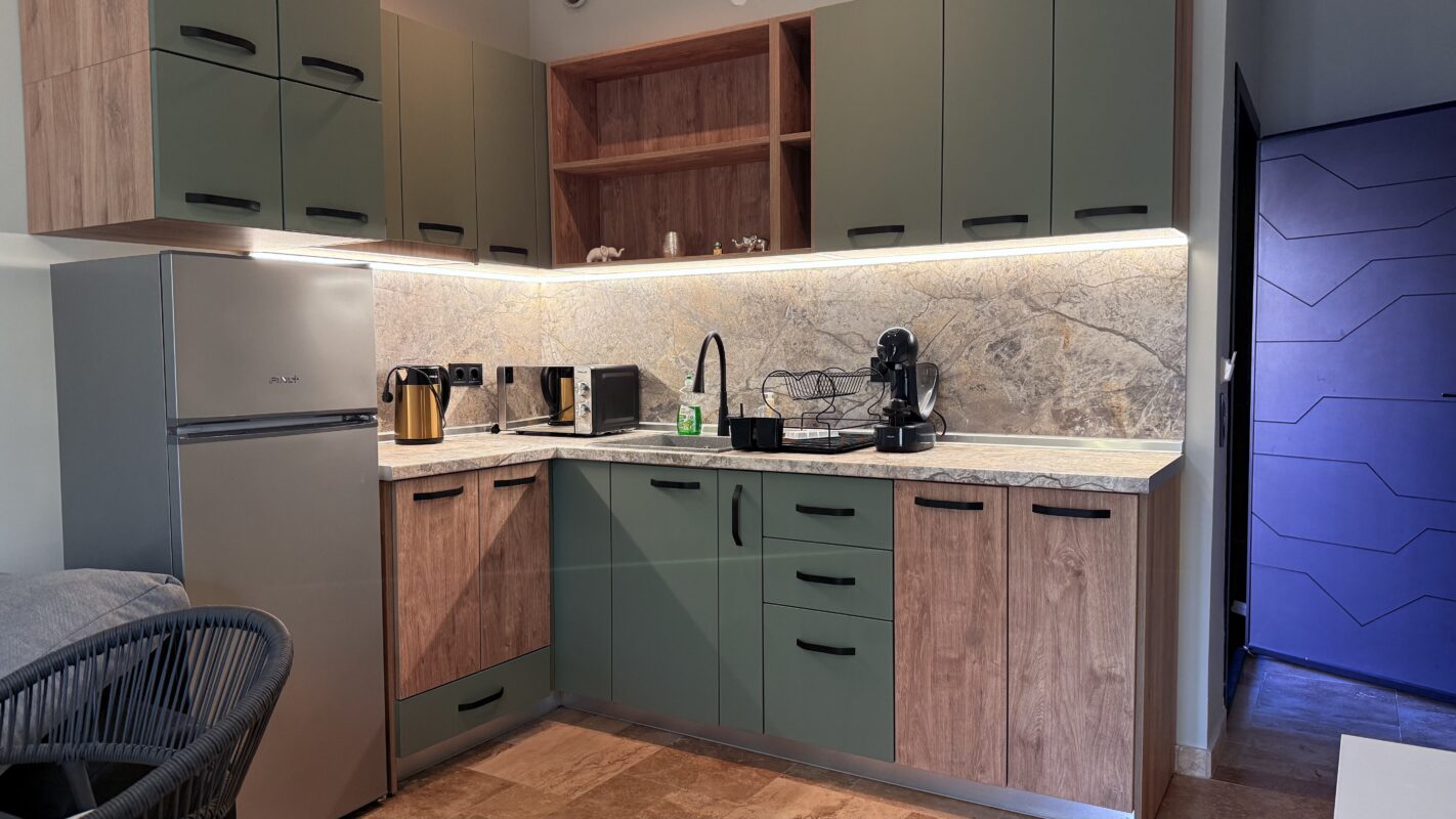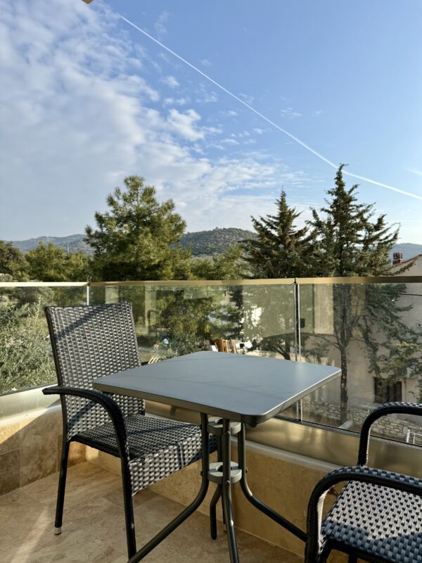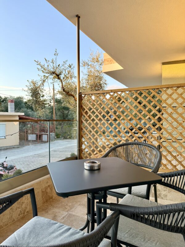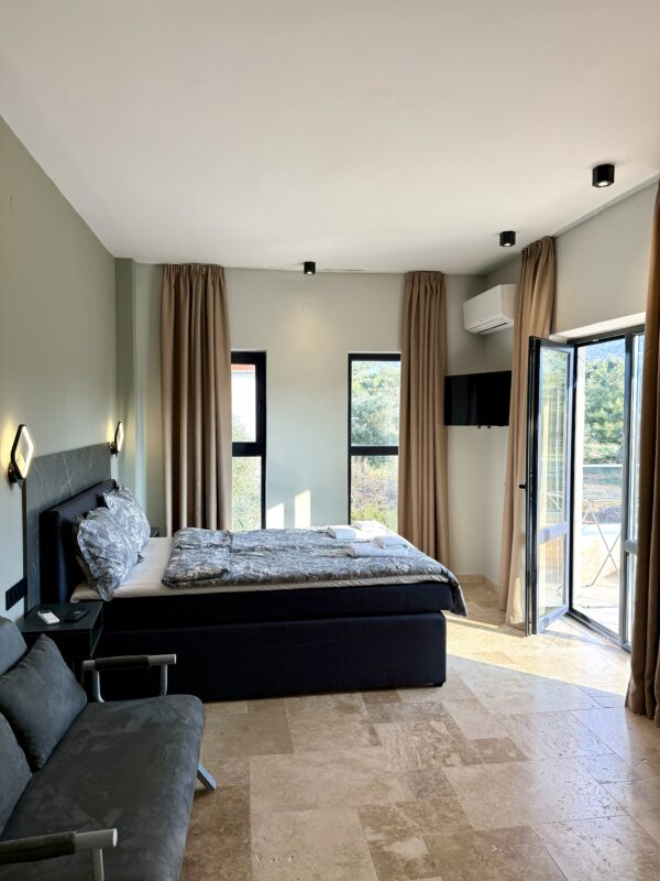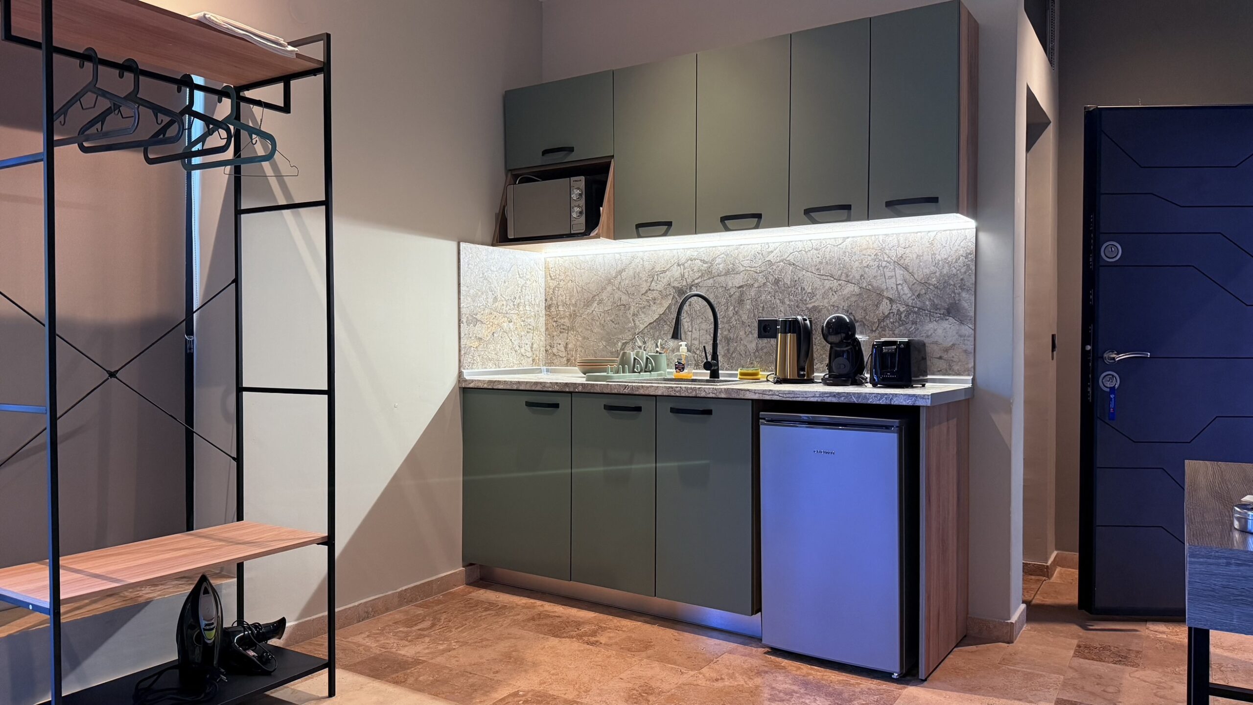 Toate unitățile dispun de baie privată, aer condiționat și conexiune Wi-Fi gratuită. Balcoanele sunt spațioase și amenajate cu zone de relaxare. Priveliștea este orientată către grădina cu măslini și lumina caldă a apusului. Fiecare unitate include o chicinetă complet utilată pentru mese ușoare. Dotările includ cuptor cu microunde, frigider, chiuvetă, fierbător electric, cafetieră, prăjitor de pâine și ustensile necesare.