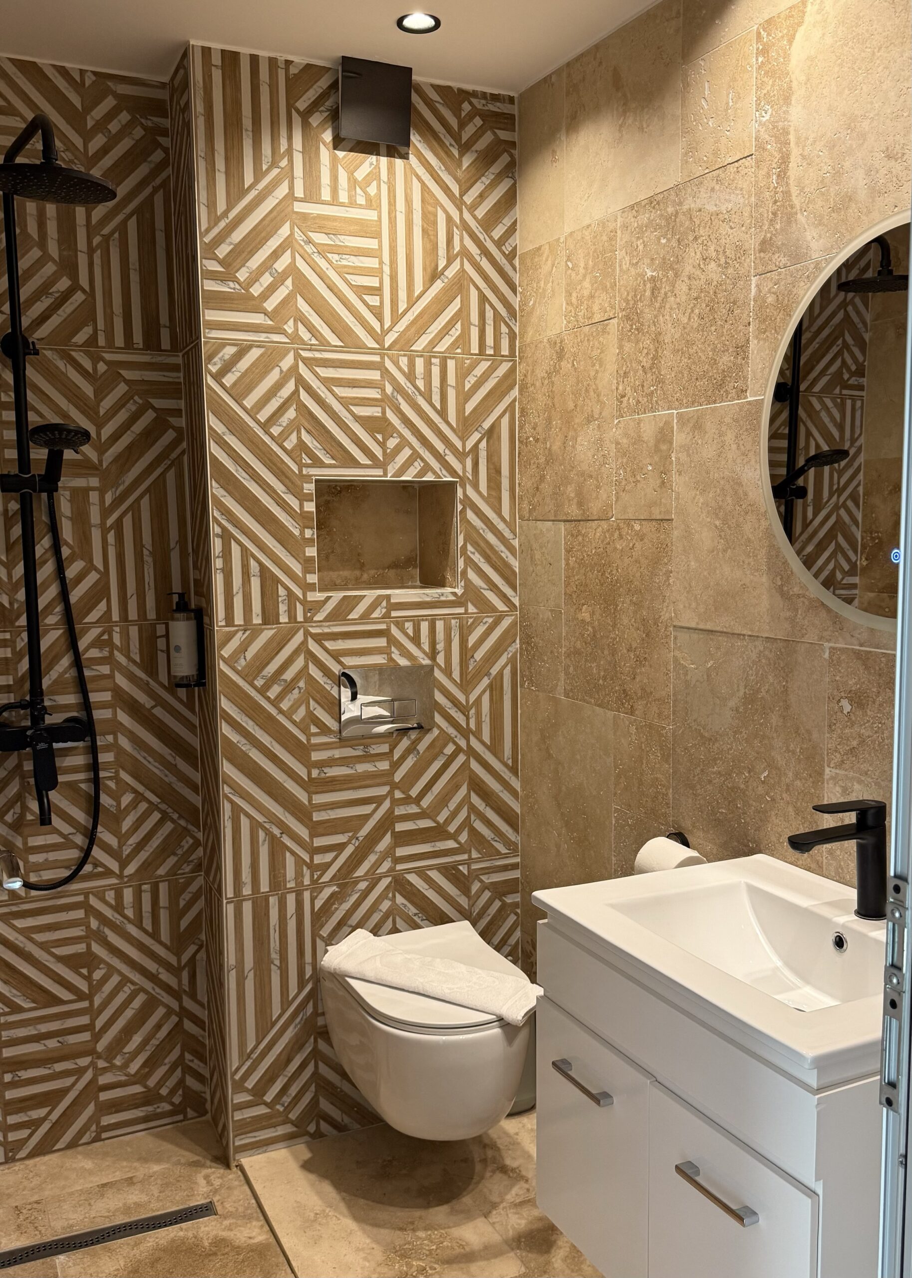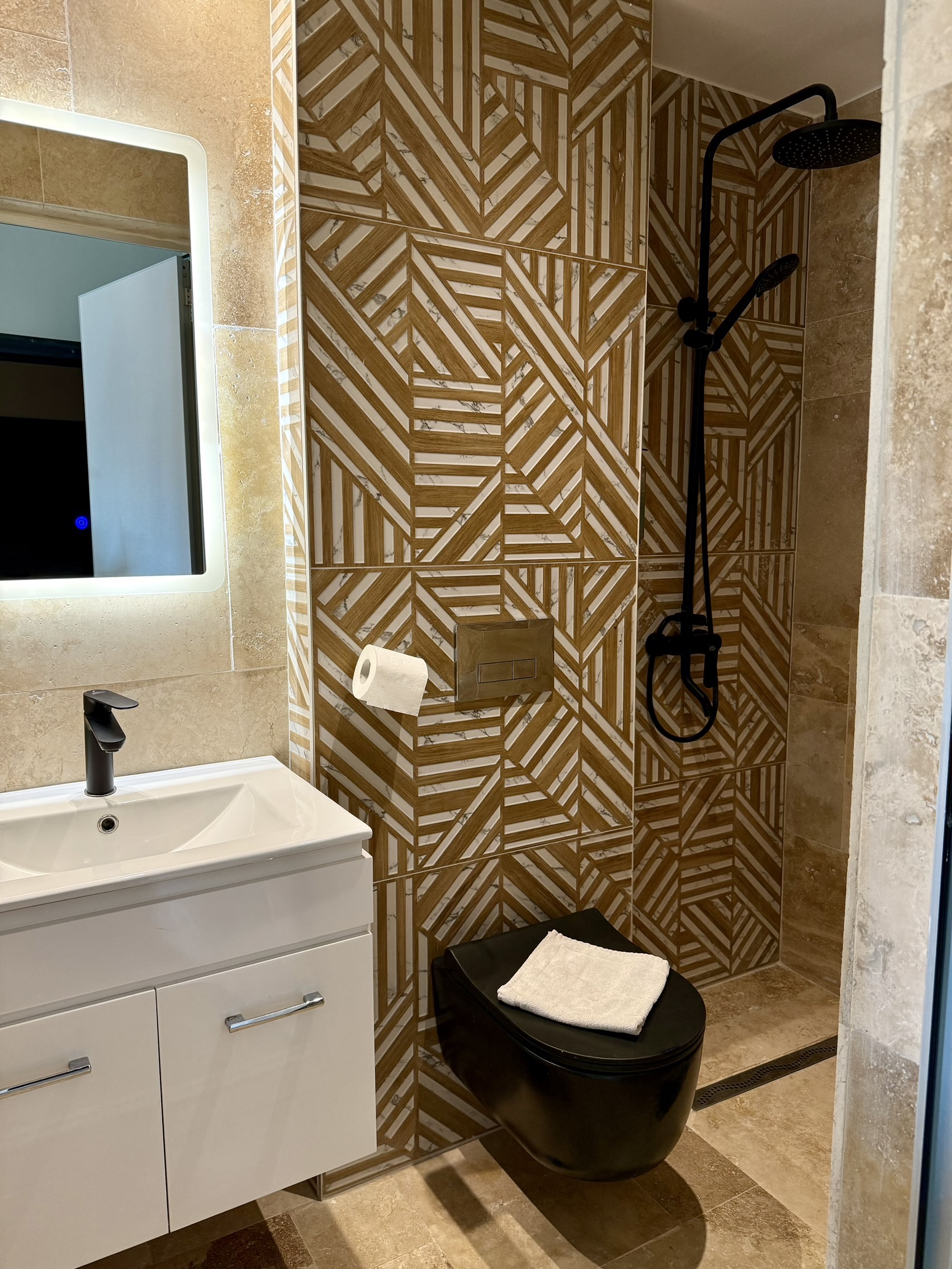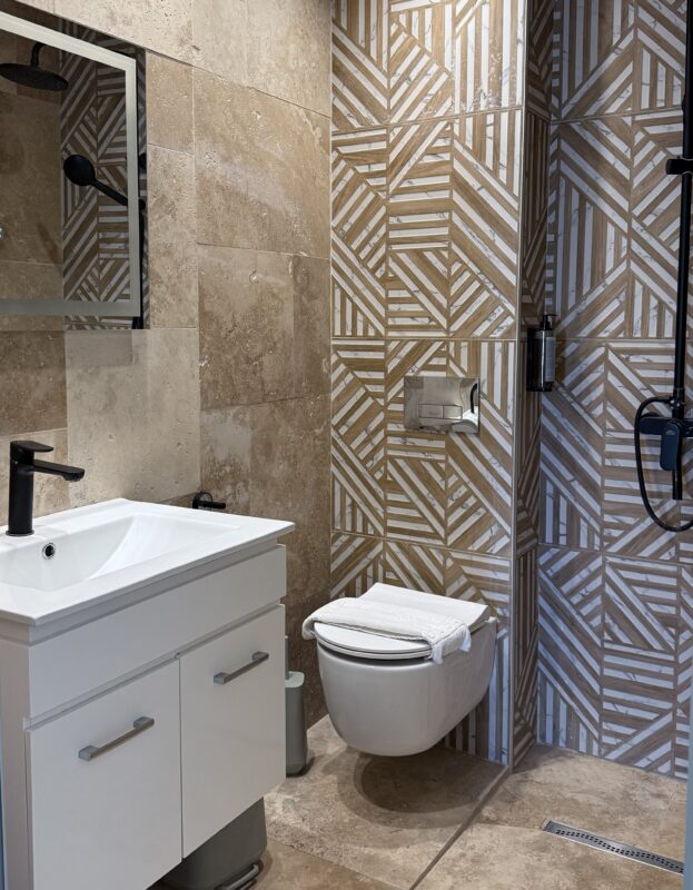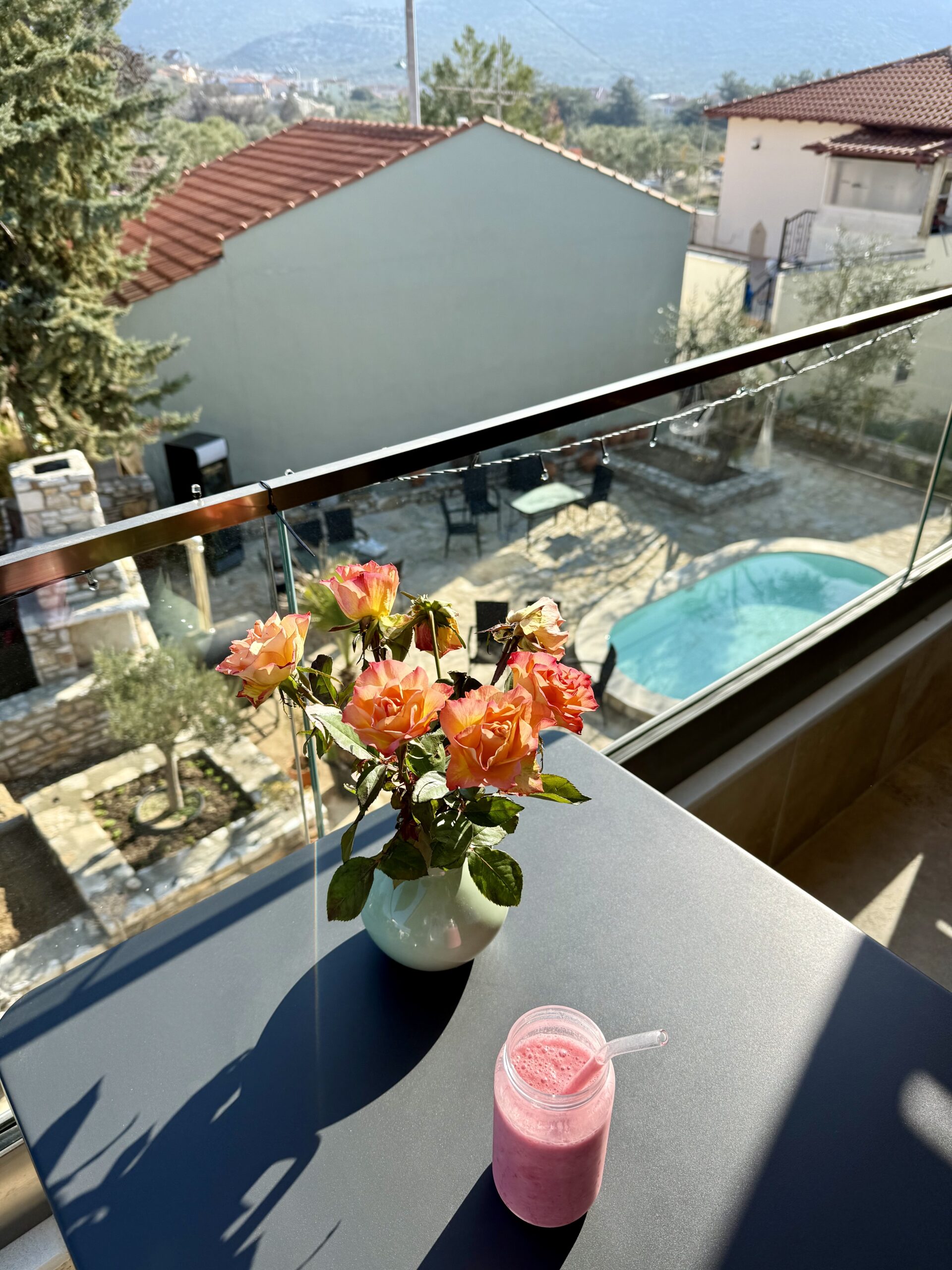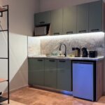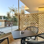 Toate unitățile dispun de baie privată, aer condiționat și conexiune Wi-Fi gratuită. Balcoanele sunt spațioase și amenajate cu zone de relaxare. Priveliștea este orientată către grădina cu măslini și lumina caldă a apusului. Fiecare unitate include o chicinetă complet utilată pentru mese ușoare. Dotările includ cuptor cu microunde, frigider, chiuvetă, fierbător electric, cafetieră, prăjitor de pâine și ustensile necesare.
