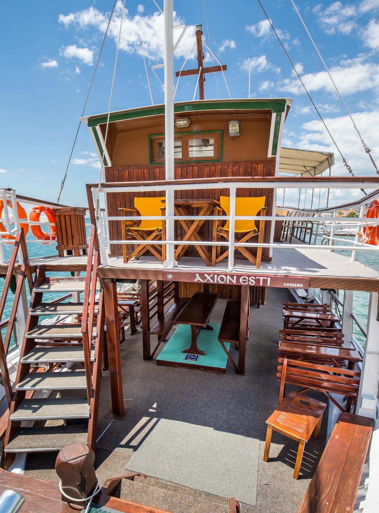 „Axion Esti” este un vas tradițional din lemn, de tip Trehantiri, construit în Ierisos, Halkidiki în anul 1988. Este realizat în întregime din lemn de pin. Are o particularitate: este mai lat decât alte bărci de acest tip, fiind conceput și construit ca navă de pasageri, investindu-se în special în asigurarea stabilității și a confortului. Are două punți deschise, spațioase, special amenajate pentru confortul a 60 de persoane, un bar și 2 WC-uri.