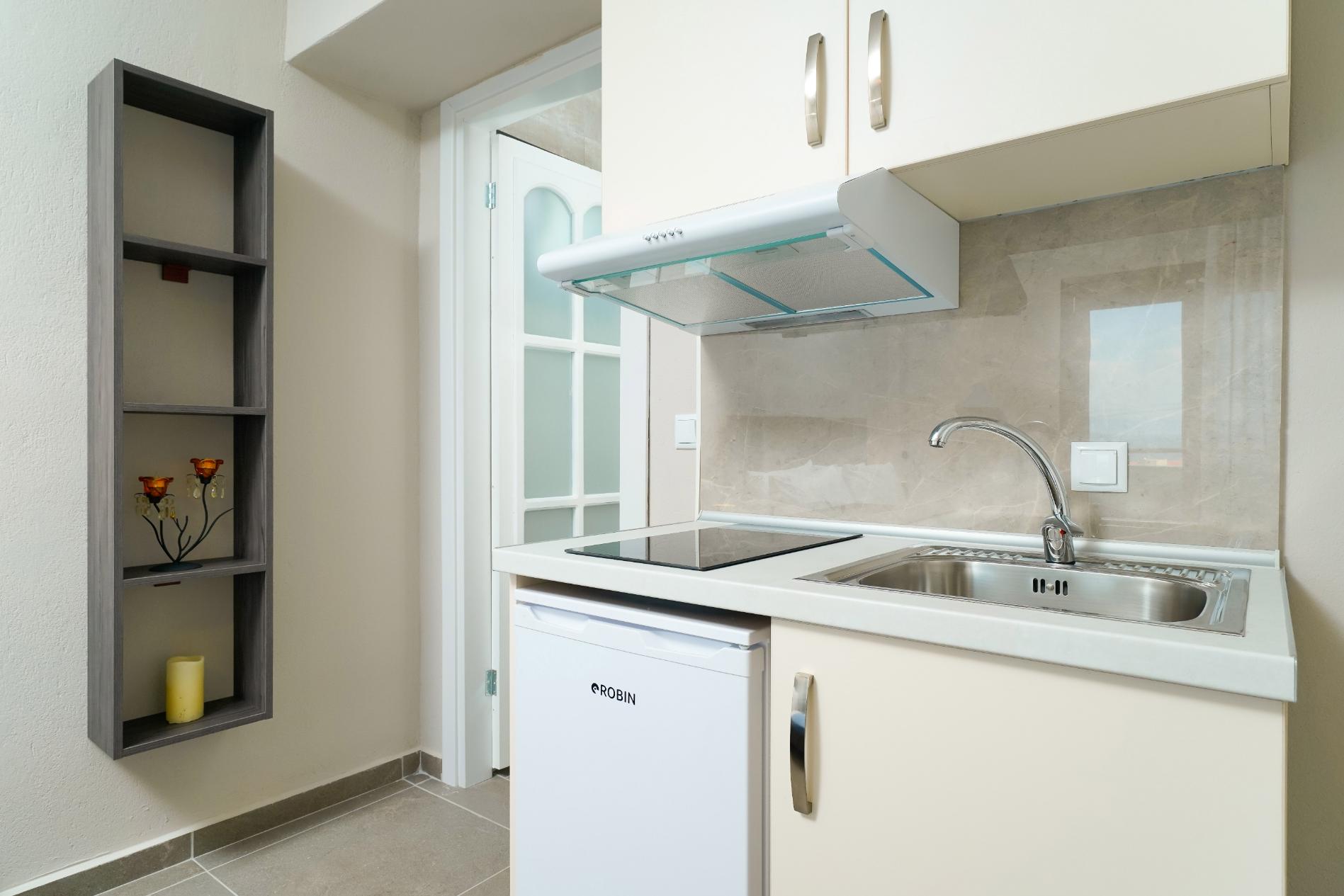 The studio was cleaned every few days, and we received fresh and fragrant towels and bed linen each time. It’s evident that great effort is put into thorough cleaning and maintenance of the accommodation – huge compliments for that! The bed is extremely comfortable, the kitchenette is small but equipped with everything necessary for preparing meals, and the air conditioning works perfectly. The bathroom is spacious enough, always clean, featuring a lovely shower cabin and a window. The courtyard of the accommodation is large and has a parking space. It is beautifully landscaped, maintained daily, and has a lovely seating area.