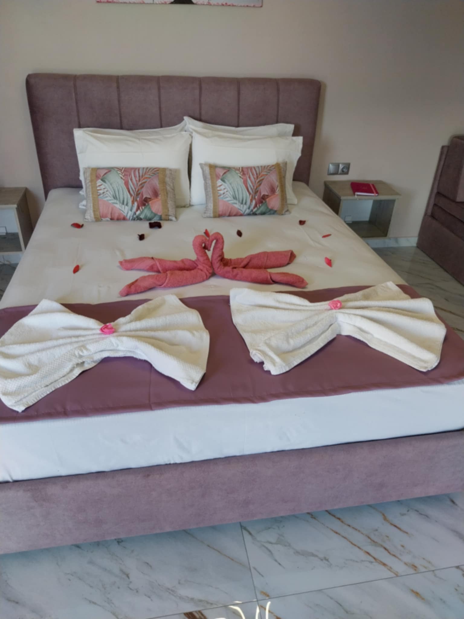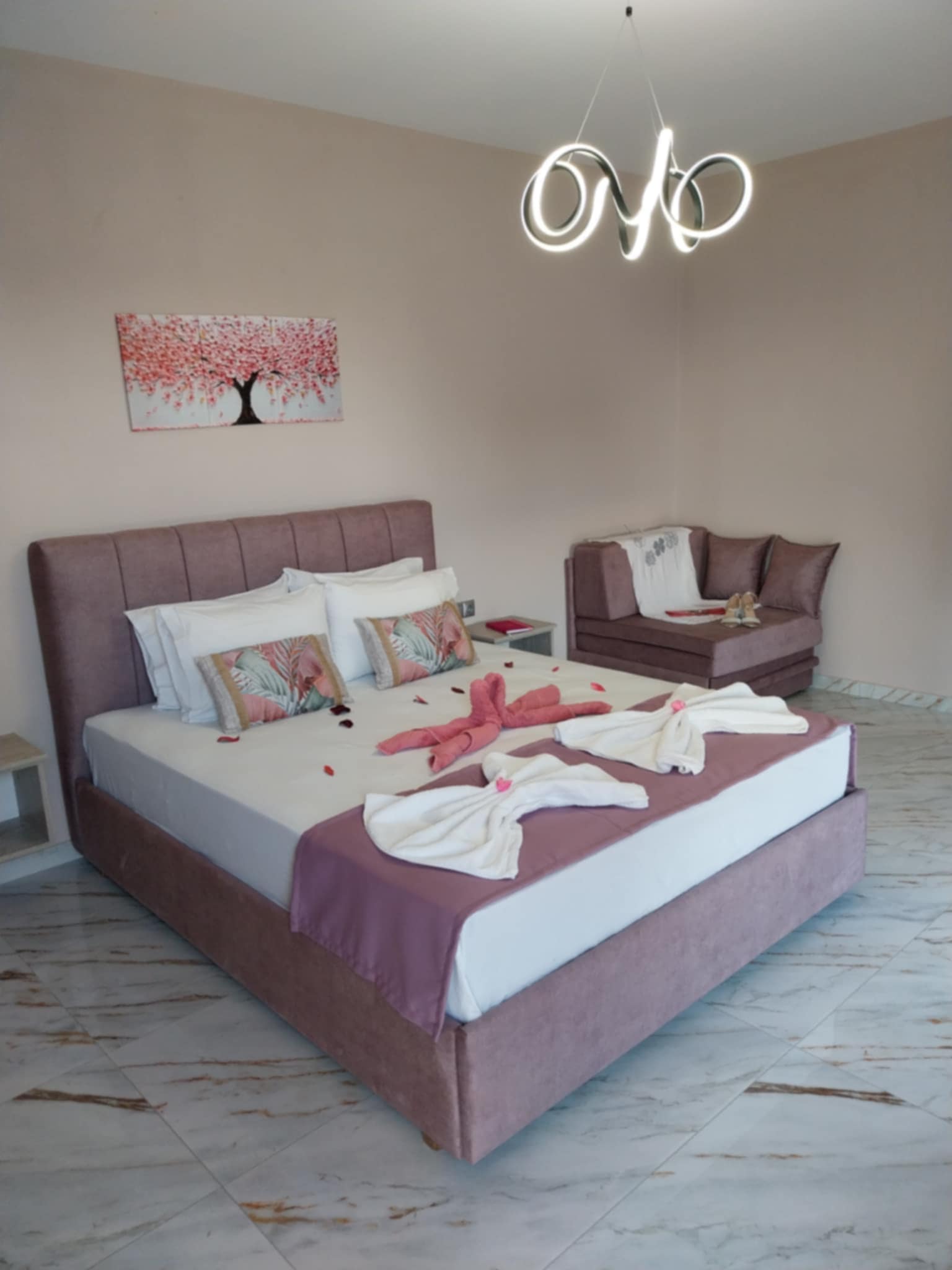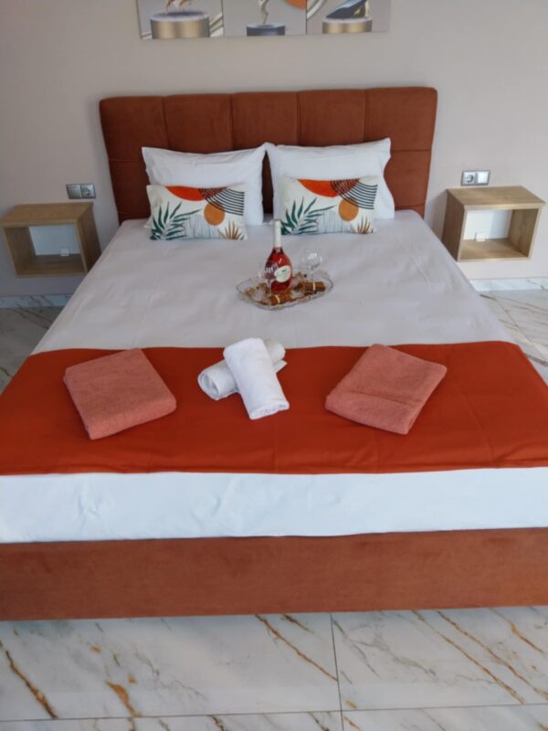 Primul studio este destinat exclusiv cazării a două persoane adulte. Acesta dispune de un pat matrimonial confortabil, o bucătărie complet utilată, aer condiționat, conexiune WiFi stabilă și parcare situată chiar în fața unității de cazare. La cerere, se poate furniza un pătuț pentru bebeluși, fără alte posibilități suplimentare de cazare.
