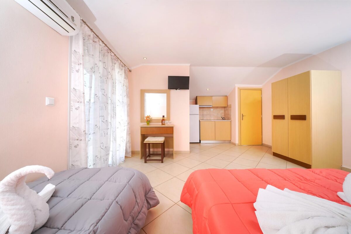 Studiourile sunt pentru două și trei persoane, precum și studiouri de familie, care pot găzdui 4 persoane. Studiourile au chicinetă complet utilată, cu plită, TV cu ecran plat cu canale prin satelit, WI-FI gratuit, aer condiționat și baie privată cu duș și uscător de păr.