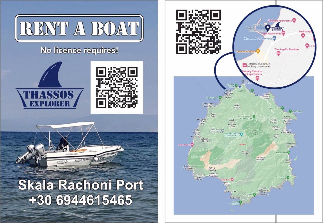 Thassos Explorer Rent a Boat este nou un centru de închiriere de ambarcațiuni de agrement, situat chiar în portul Skala Rachoni. Aveți posibilitatea să închiriați bărci fără căpitan (conduceți dumneavoastră). Beneficiați de o experiență de navigare, fără a fi necesar să dețineți un permis de conducere.