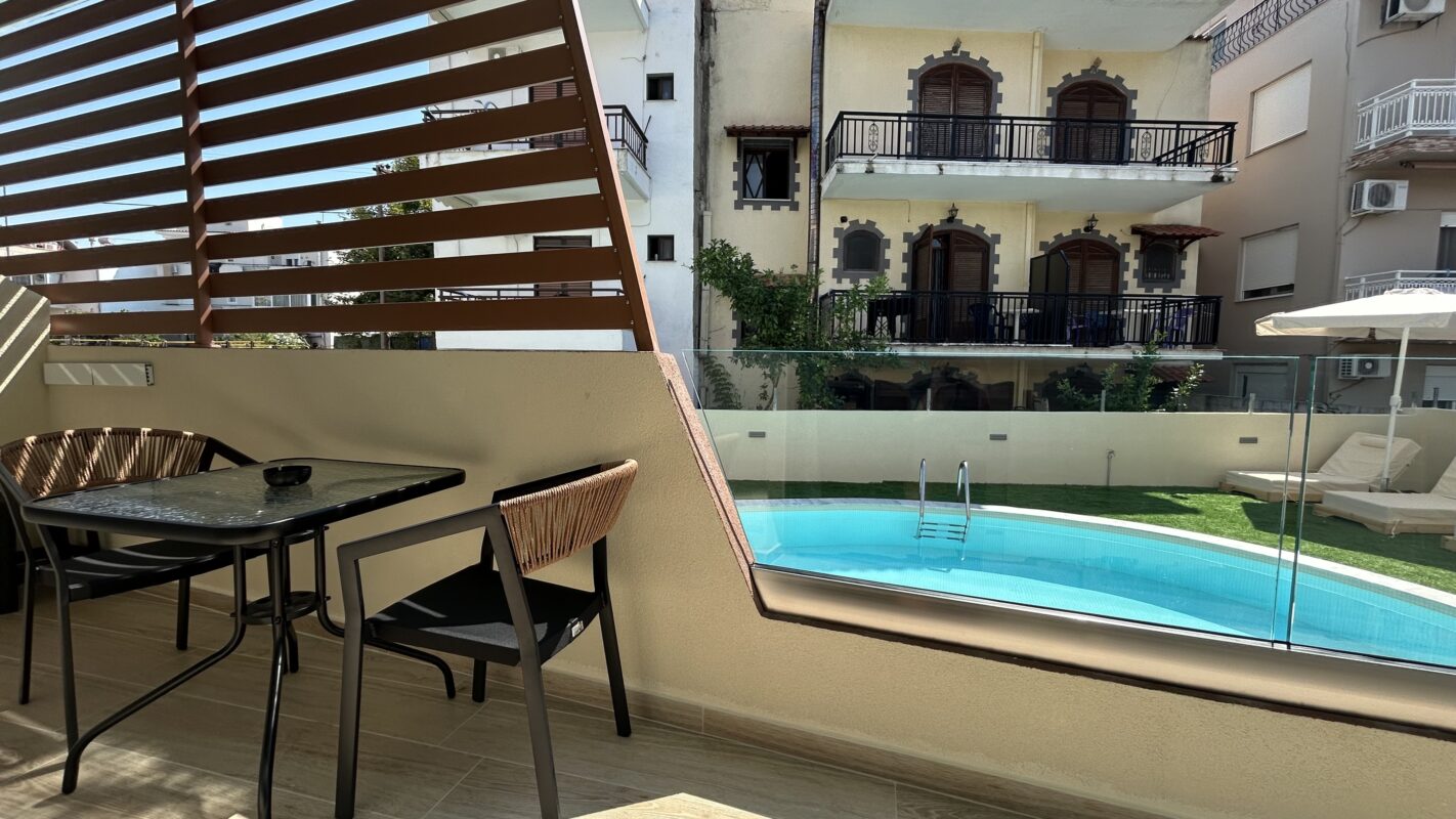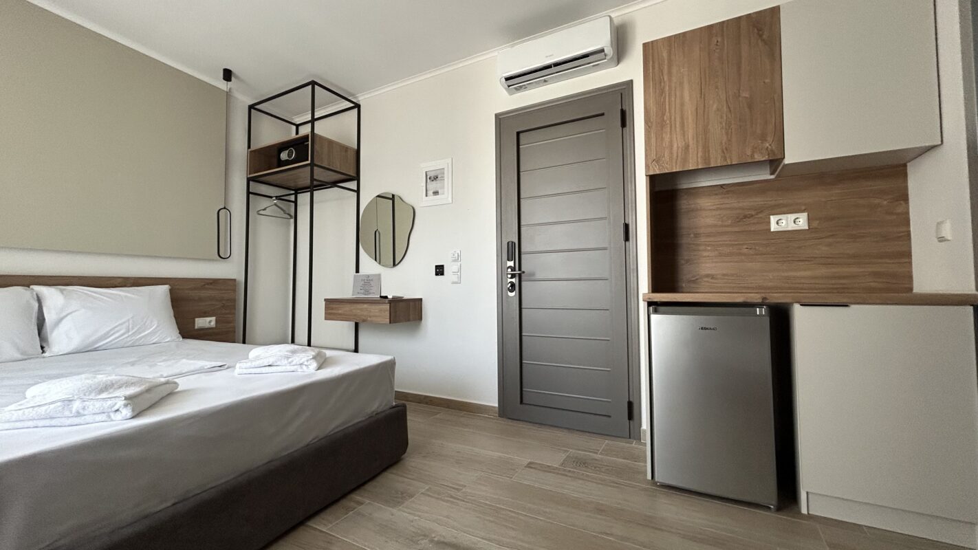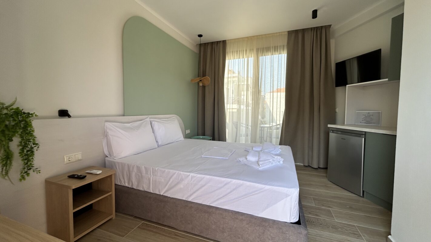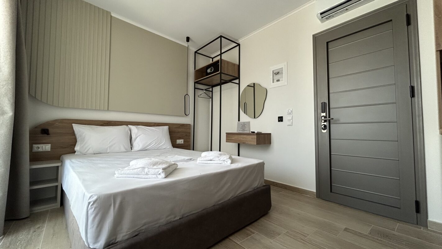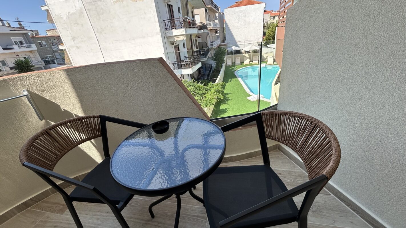 Camerele noastre moderne, recent construite, pot găzdui între două și patru persoane. Sunt potrivite atât pentru cupluri, cât și pentru familii sau grupuri mici care caută cazare convenabilă în Limenaria. Fiecare cameră este dotată cu aer condiționat, Wi-Fi gratuit și balcon privat. Balconul oferă vedere spre piscină sau spre drumul principal.