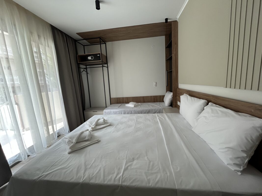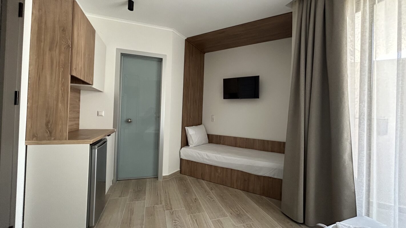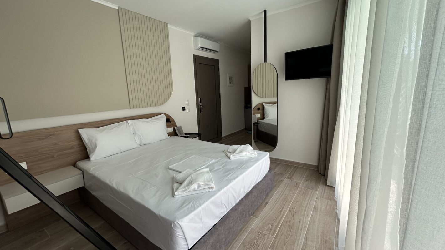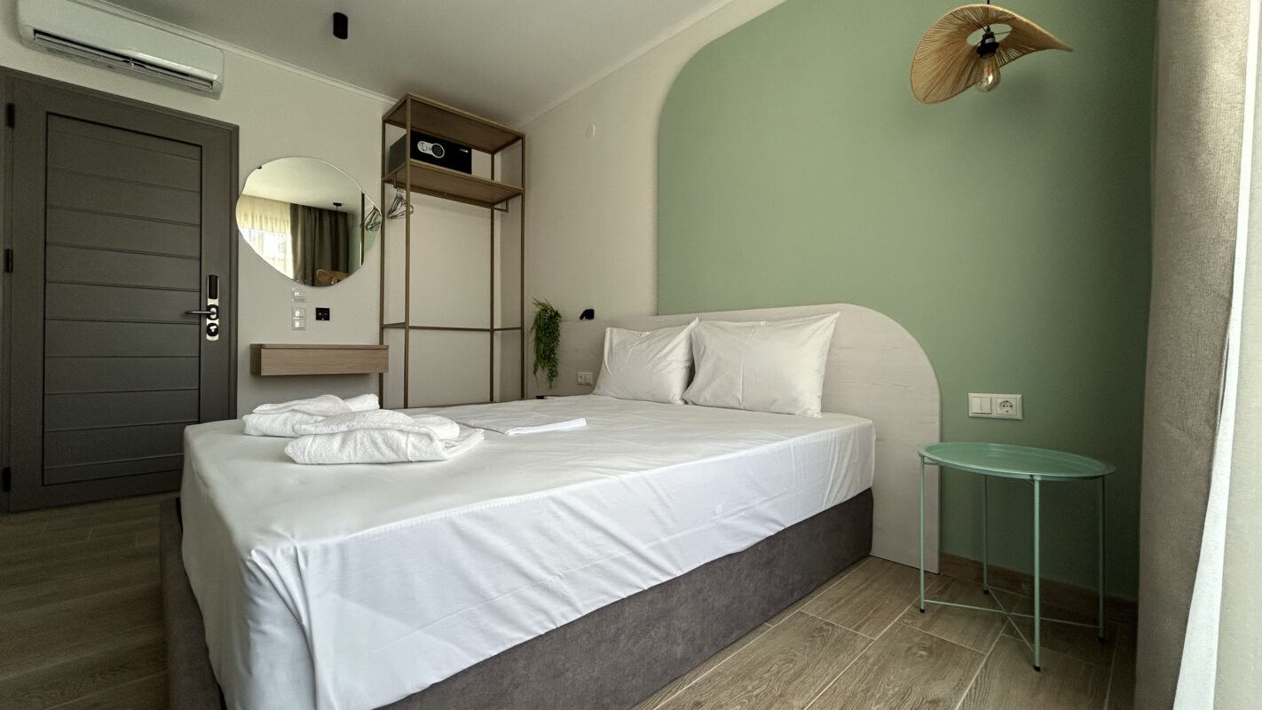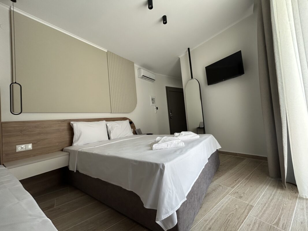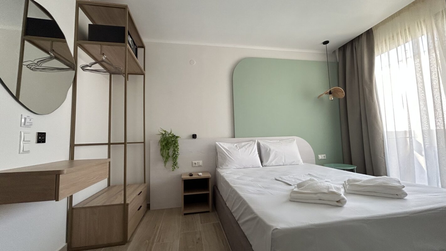 Camerele noastre moderne, recent construite, pot găzdui între două și patru persoane. Sunt potrivite atât pentru cupluri, cât și pentru familii sau grupuri mici care caută cazare convenabilă în Limenaria. Fiecare cameră este dotată cu aer condiționat, Wi-Fi gratuit și balcon privat. Balconul oferă vedere spre piscină sau spre drumul principal.