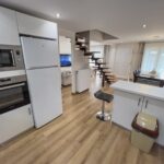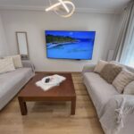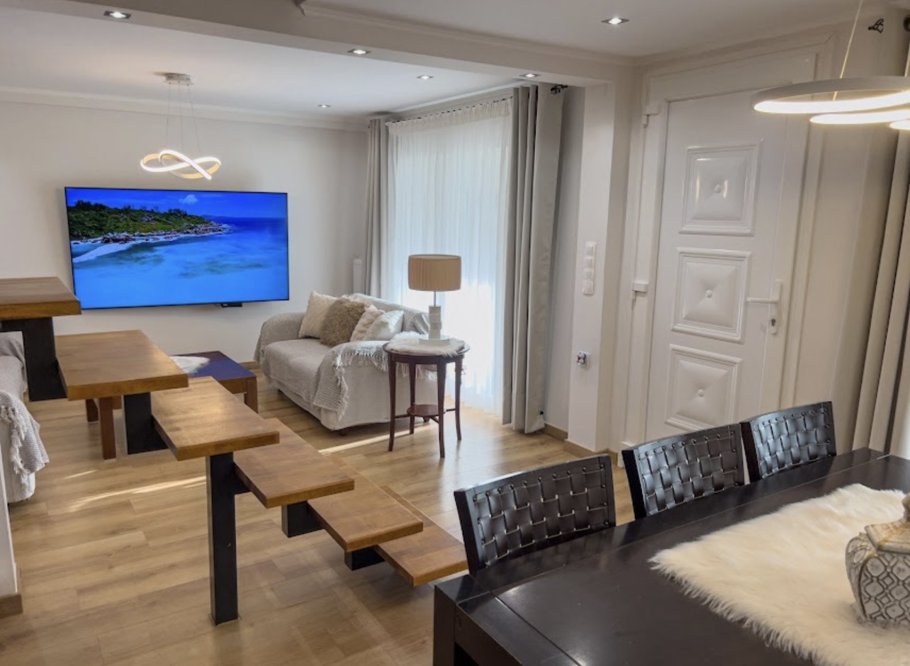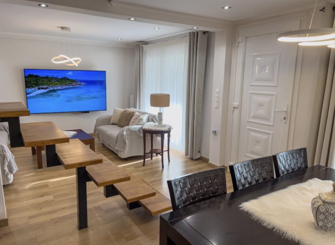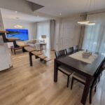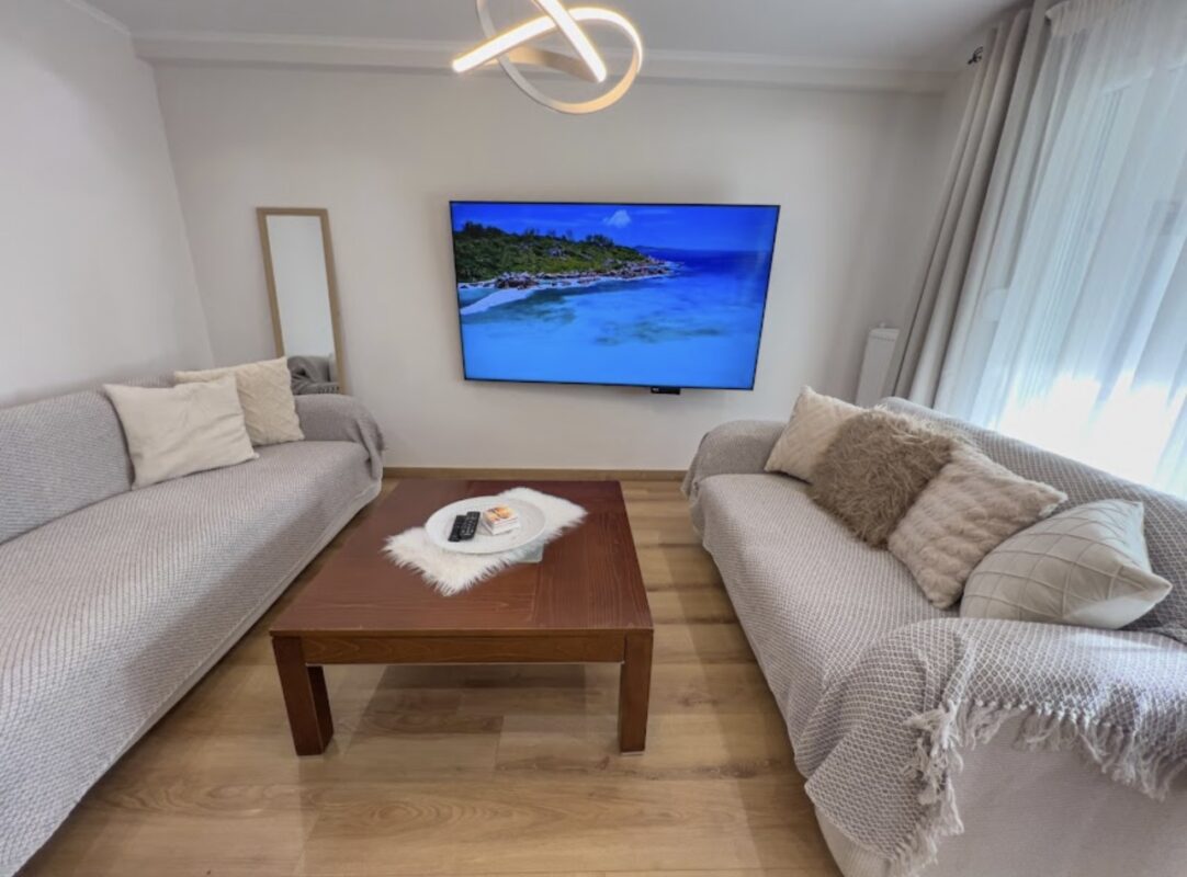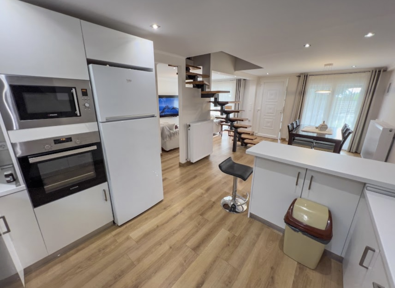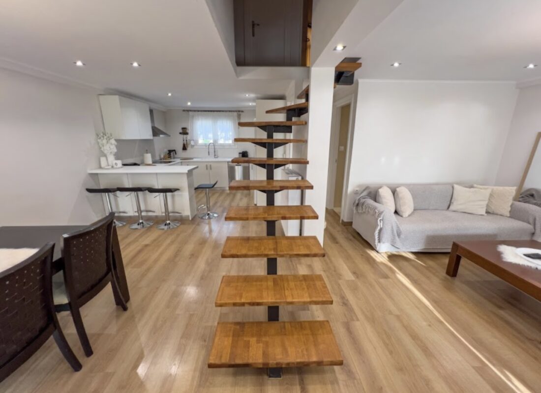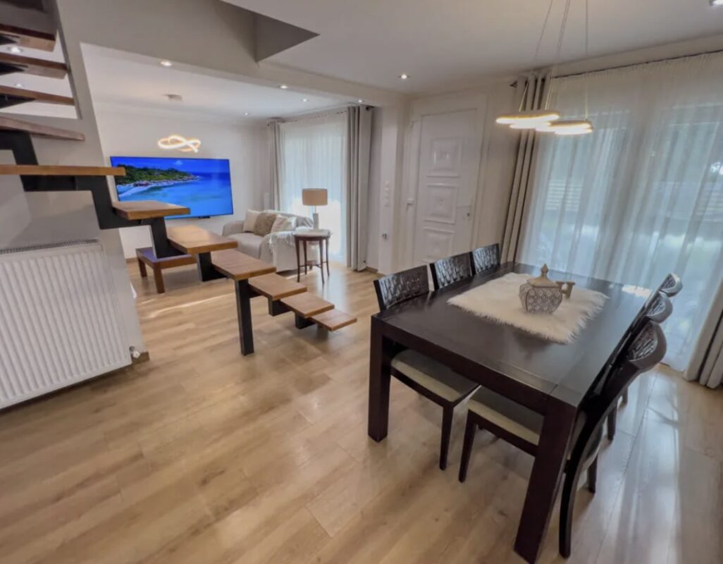 La parter este organizat un spațiu open-space ce include living, zonă de dining și bucătărie complet utilată. Este disponibilă și baia principală, accesibilă tuturor oaspeților. Livingul este dotat cu două canapele confortabile, una cu trei locuri și una cu două locuri. Televizorul smart de dimensiuni mari oferă opțiuni variate de divertisment. Configurația spațiului facilitează interacțiunea și relaxarea în condiții optime.