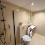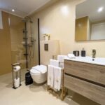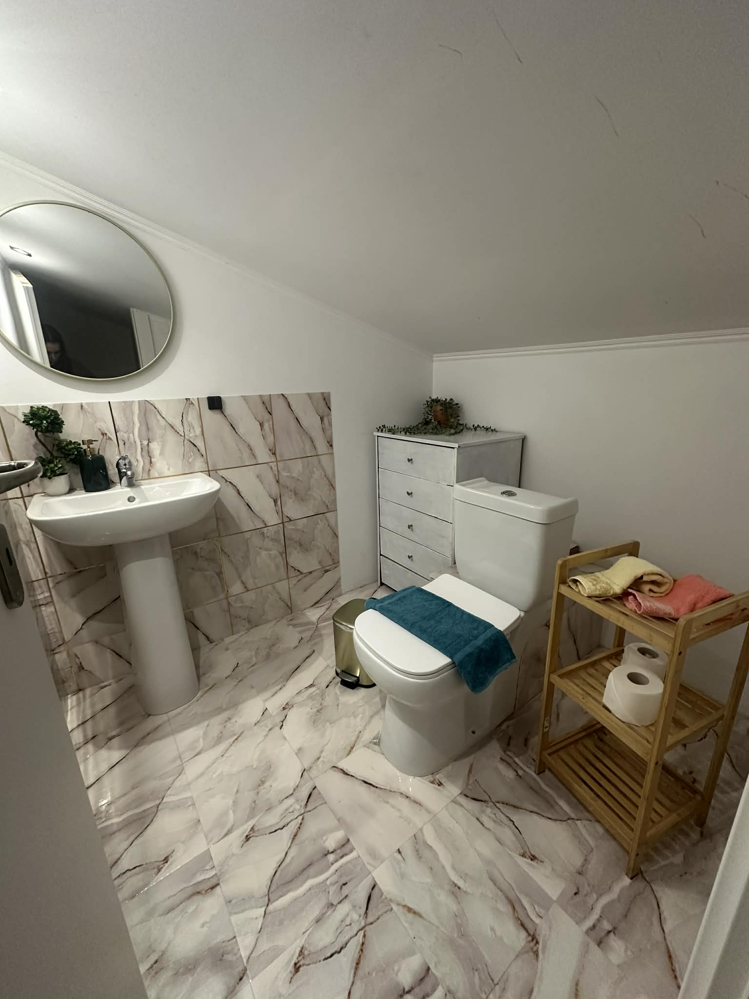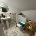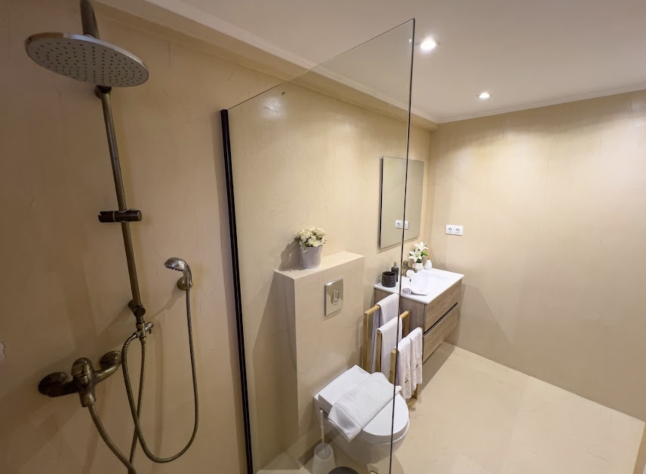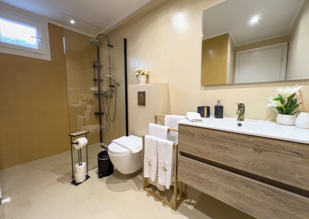 La etaj sunt amplasate trei dormitoare, dintre care două sunt dotate cu paturi duble. Al treilea dormitor dispune de un pat single, cu posibilitatea adăugării unui pat suplimentar pliabil. Capacitatea de cazare poate fi astfel extinsă în funcție de necesități. Există și o a doua baie, destinată confortului suplimentar al oaspeților. Fiecare dormitor beneficiază de aer condiționat pentru temperatură optimă în sezonul cald.