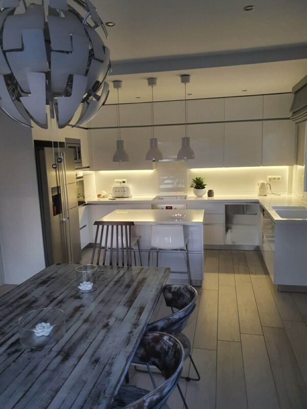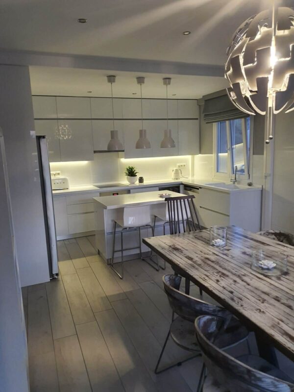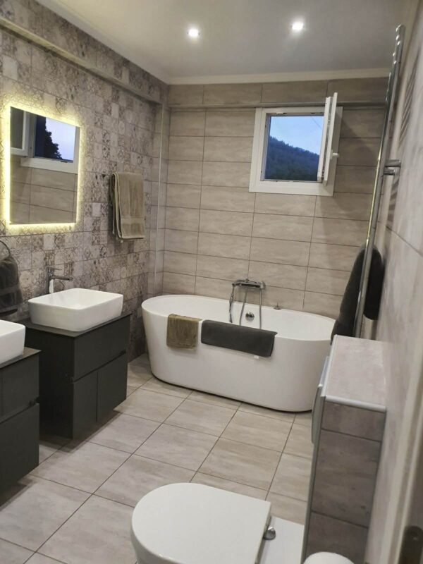 Proprietatea dispune de trei dormitoare confortabile, potrivite pentru familii sau grupuri restrânse. Cele două băi moderne sunt echipate cu facilități actuale. Fiecare spațiu este amenajat atent pentru a asigura funcționalitate maximă. Designul interior combină elemente contemporane cu accente tradiționale. Astfel, se creează un ambient echilibrat și plăcut.