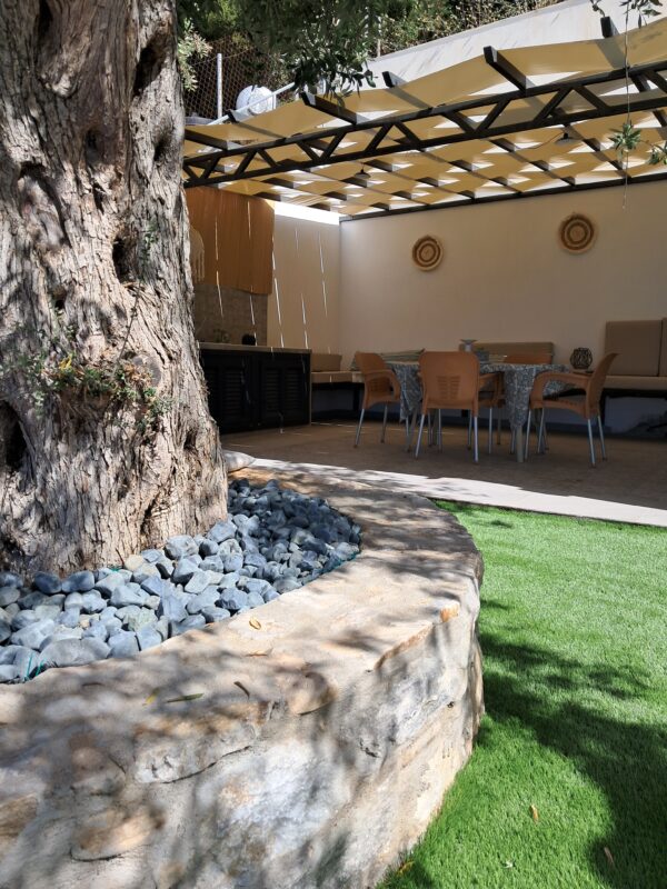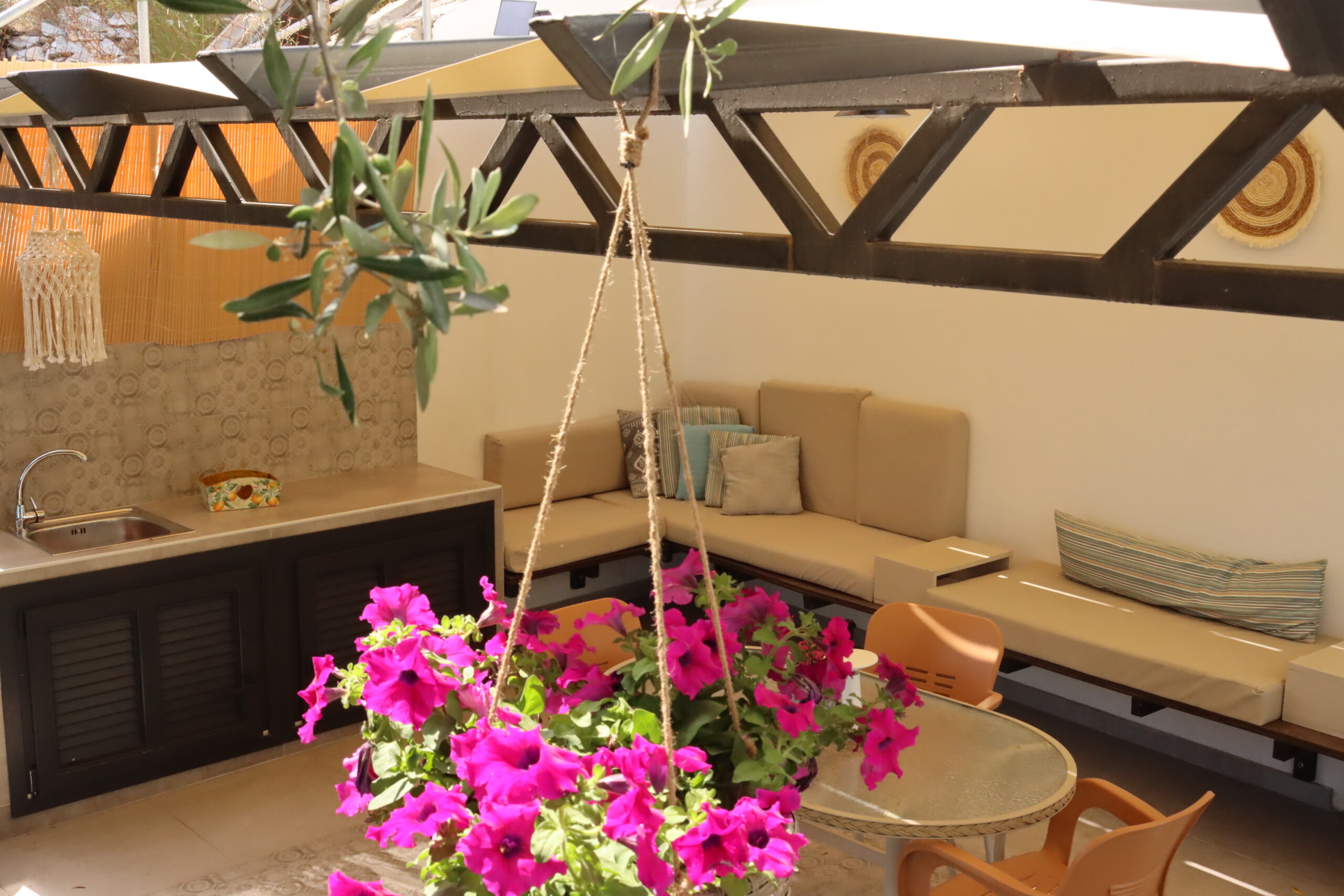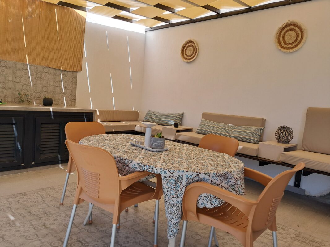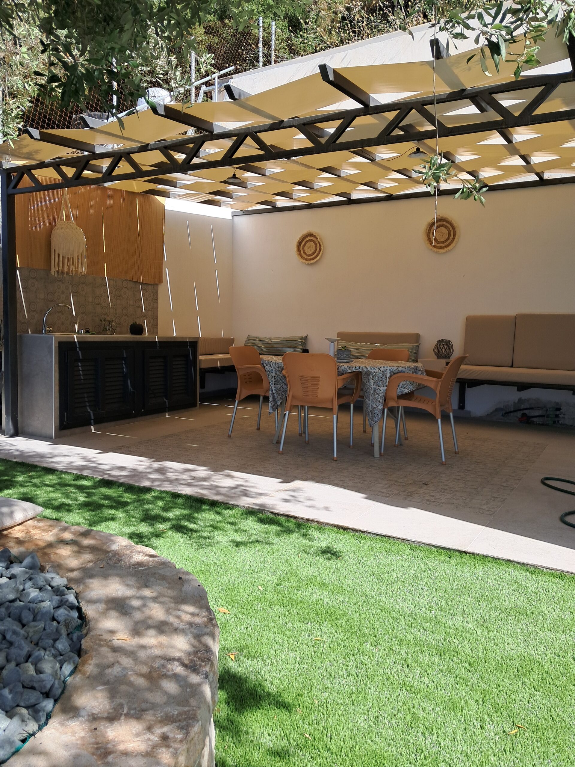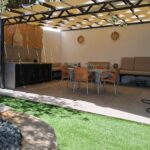 În curte este amenajată o terasă cu grătar, spațiu de luat masa și de relaxare.