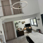 În living-ul spațios un fotoliu, canapea, televizor cu ecran plat, zonă de luat masa.