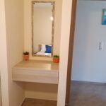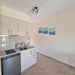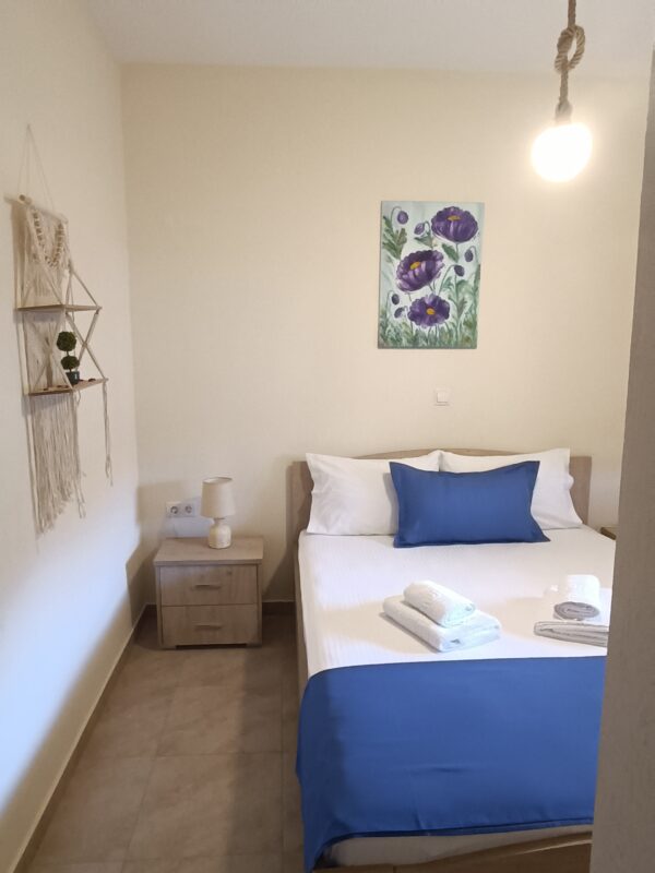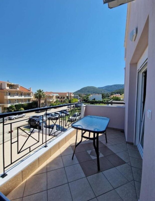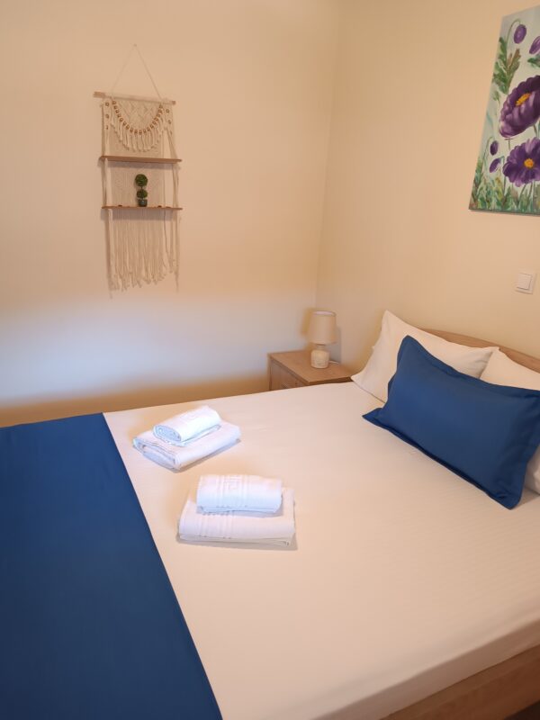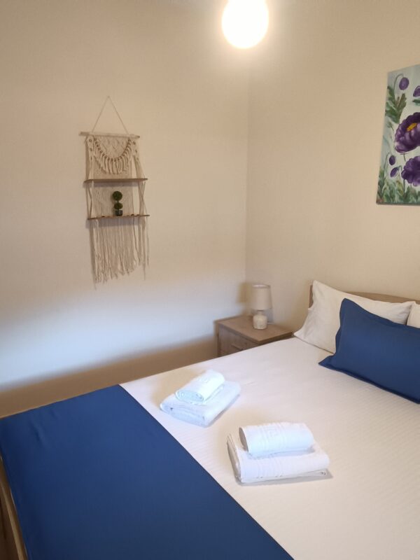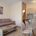 Al treilea apartament este destinat familiilor mici formate din maximum trei persoane. Acesta include un dormitor cu pat dublu și zonă de living funcțională. Canapeaua extensibilă asigură spațiu suplimentar pentru odihnă. Fiecare apartament dispune de balcon privat cu vedere către zonă. Bucătăriile sunt complet echipate pentru gătit zilnic. Băile sunt moderne și dotate corespunzător.